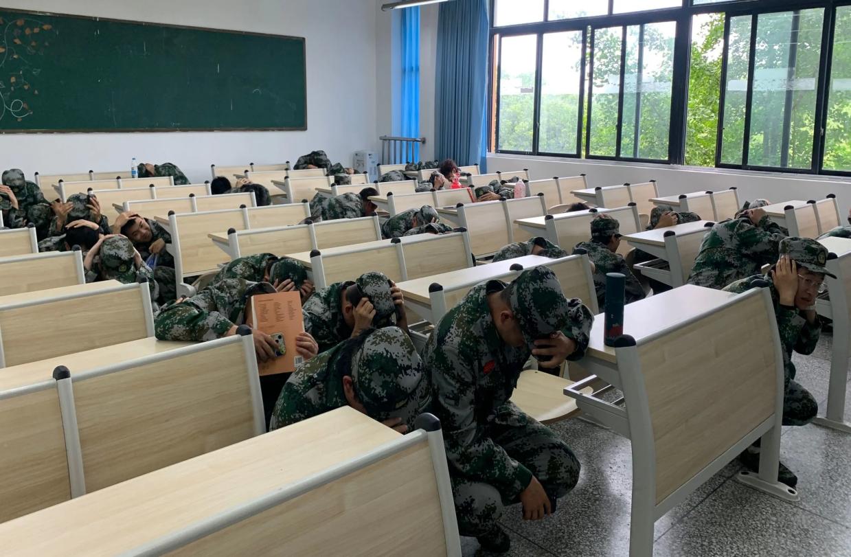 党总支书记、辅导员深入班级指导同学们学习防震应急避险和自救互救技巧,普及防灾减灾知识,引导学生关注身边的灾害风险,增强防震减灾意识。随着第一声铃声响起,全体师生模拟在课堂上突发地震时的应急防护,上课教师指导学生立即钻在桌子下或躲在教室墙角进行避险。第二声铃声后,学生以班级为单位,按应急疏散图,沿着安全出口进行紧急疏散。在1分钟内全体师生快速、有序地撤离到了安全地带,集合整队。