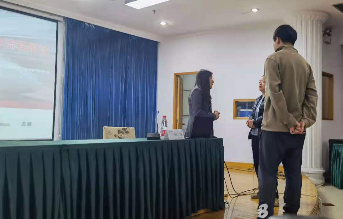 图一:中车大学副校长曾金传讲话 随后中车大学职改办主任方雁为大家解读了1+X中车实施方案以及考评员工作流程。就考核站点建设以及考核大纲的细节问题,何劲辉老师在课间向方主任进行的详细的咨询。