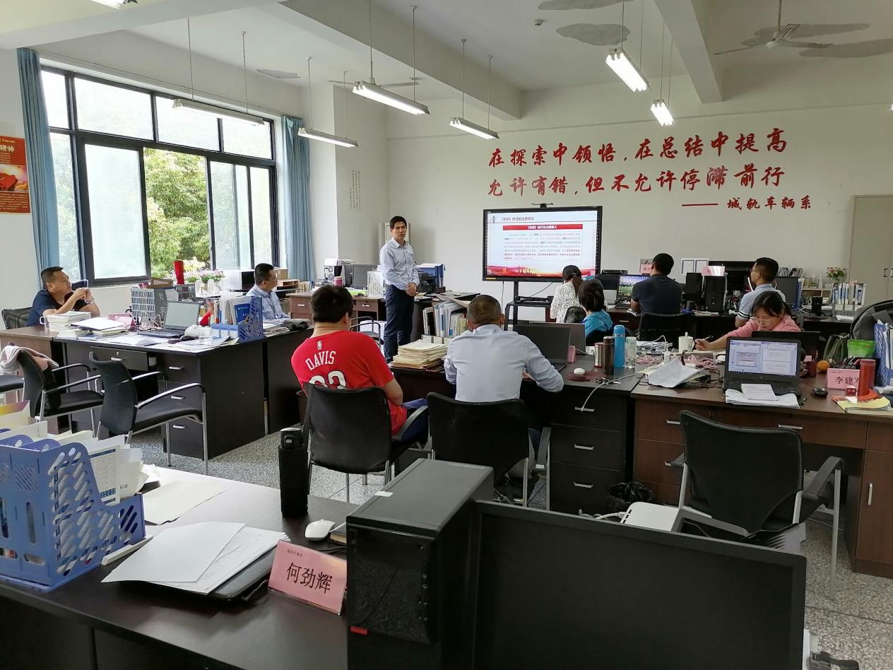 2021年5月24日下午,城轨车辆系党总支在1315组织开展“坚定红色信仰,礼赞建党百年”系列活动之党史学习主题党日活动,全体教职工参与,本次活动由系党总支书记龙明贵主持。 系党总支组织委员郭尧鹏对《中国共产党简史》部分学习内容向在场的老师做了分享和交流。郭尧鹏同志回顾了从1949年新中国的成立到1992年邓小平南方谈话这一历史阶段中的主要历史事件,图文并茂地呈现了中国共产党“在探索中求发展,在改革中开新局”的历史进程。同时也向大家客观地分析这一历史时期中的经验和失误。 系党总支书记龙明贵带领教职工们学习《中国共产党普通高等学校基层组织工作条例》,向大家阐释了《条例》修订的主要意义、主要原则、主要原则;通过对《条例》的解读,向大家说明了“基层党组织怎么设”以及“基层党组织怎么干”。同时结合我系工作实际,对加强我系党建和思想政治工作队伍建设提出了具体要求。 本次主题党日活动,让教职工们从历史中汲取了智慧和力量,传承勇于探索改革的精气神,做好教育教学工作的担当与底气,进一步推动系部发展。
