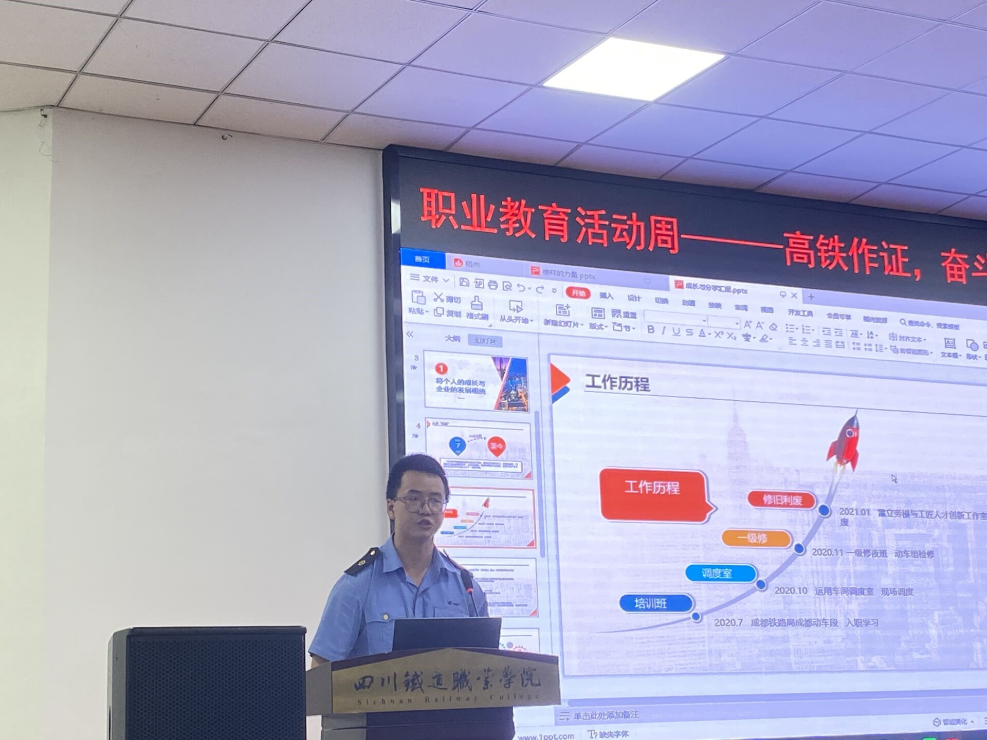 张辛权现场分享 陈守亮是重庆机务段内江运用车间指导司机,工作30年安全行车未发生一次事故和机破,在机务系统大比武中屡获佳绩,现在是成都铁路局首席技师。因疫情原因,陈守亮本次未能到场,通过“历练是一种成长”的报告视频,从传承——遇到一位严厉的师傅、坚守——在平凡的岗位中永葆党员本色、创新——不断练就新技能、开拓——我们都是追梦人四个方面与同学们进行交流分享。