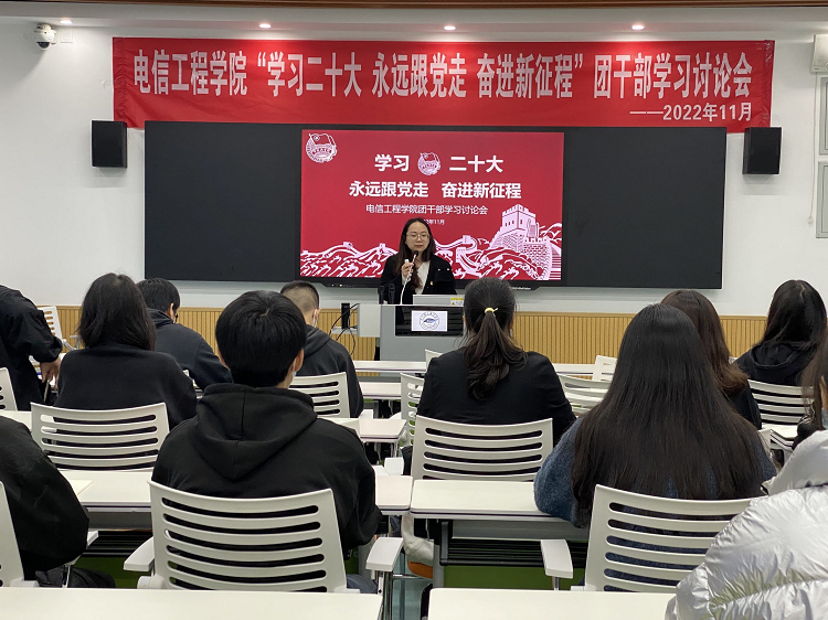 2022年10月16日上午,中国共产党第二十次全国代表大会在北京人民大会堂隆重开幕。党的二十大是在全党全国各族人民迈上全面建设社会主义现代化国家新征程、向第二个百年奋斗目标进军的关键时刻召开的一次十分重要的大会。习近平总书记向大会作了报告,这份报告凝聚了全党智慧,制定了全党全国各族人民下一步的行动纲领和大政方针。为深入学习贯彻落实党的二十大精神,坚定不移听党话、跟党走,帮助团学干部立志做有理想敢担当能吃苦肯奋斗的新时代好青年,电信工程学院组织全院团学干部于11月8日在1209教室召开了“学习二十大 永远跟党走 奋进新征程”学习研讨会。会议由学院团总支书记唐宁晓老师主持。 本次研讨会分为两个部分,第一部分唐宁晓老师分别从党的二十大报告重要论述以及“五个牢牢把握”两个方面带领团学干部学习党的二十大会议精神。讲清楚了目前中国共产党的中心任务是团结带领全国各族人民全面建设社会主义现代化强国、实现第二个百年奋斗目标,以中国式现代化全面推进中华民族伟大复兴。唐宁晓老师要求全部团学干部要牢记五个“必由之路”,理解“五个牢牢把握”,立志做有理想敢担当能吃苦肯奋斗的新时代好青年。 第二部分由学院团总支副书记杨梓晨、团支部书记代表梁雨玥、刘定祎、赵梓涵做学习二十大精神的分享发言。杨梓晨分享到:“我们是幸运的一代人,身在红旗下,长在春风里,我们没有经历战火的摧残,也没有经历改革开放初期的艰辛。但我们身在先辈的余荫下,理应不忘初心,牢记使命,树立远大的理想和抱负,将人生理想融入国家和民族的事业中,在不懈奋斗中实现自己的人生价值。作为新时代的一名青年学子,理应勇做走在时代前面的奋进者、开拓者、奉献者,努力使自己成为祖国建设的有用之才、栋梁之材,为实现中国梦奉献智慧和力量。”梁雨玥说到:“党的二十大胜利召开,事关党和国家事业继往开来,事关中国特色社会主义前途命运,事关中华民族伟大复兴。我怀着激动的心情观看了二十大直播,看到党所做出的一系列为民大事要事,以及我国所取得的一系列重大成就,我感到无比骄傲和自豪!” 毛泽东同志为陕北公学成立题词时说:“要造就一大批人,这些人是革命的先锋队。这些人具有政治远见。这些人充满着斗争精神和牺牲精神。”通过此次学习讨论会,电信工程学院的团学干部们纷纷表示,新时代的团员青年们如初升的朝阳,不断积聚着能量,青年们会把党和国家的希望扛在肩上,终有一刻要把自己的青春和热血撒满祖国大地,在实现中华民族伟大复兴的征程上贡献青春力量。