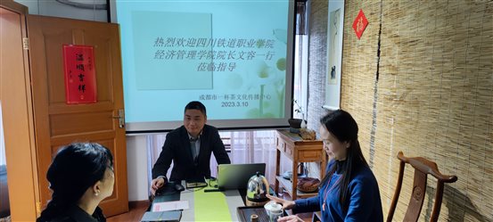 文容一行与成都市一杯茶文化传播中心负责人曾福银进行了深入交流,对方详细介绍了成都市一杯茶文化传播中心的发展历程、经营管理现状以及所辐公司的用人需求。双方以“茶”为引领畅谈产教融合、校企合作,双方希望今后在教学方式创新、师资共享、校企合作等方面进一步合作,共同推进人才培养的高质量发展。