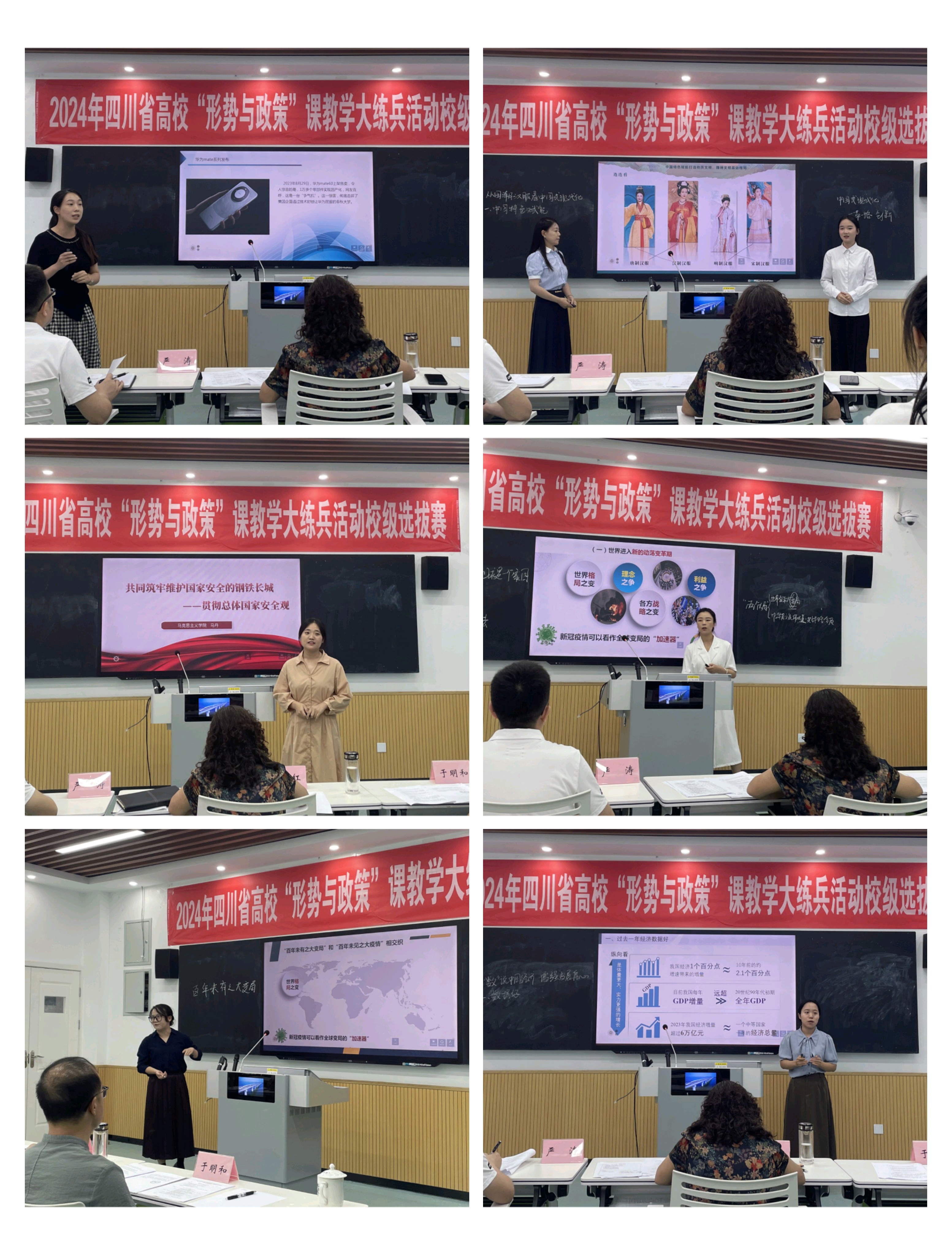 为深入学习贯彻落实习近平总书记对学校思政课建设的重要指示精神,进一步提高pp电子“形势与政策”课教师教学能力和水平。根据pp电子游戏官网《关于组织2024年四川省高校“形势与政策”课教学大练兵活动校级选拔赛的通知》要求,pp电子2024年四川省高校“形势与政策”课教学大练兵活动校级选拔赛于7月5日下午在2302智慧教室如期举行。入围校级选拔赛的6名专兼职教师参加了此次比赛,全体思政课教师到现场学习观摩。马克思主义学院院长朱红,副院长严涛,毛泽东思想和中国特色社会主义理论体系概论教研室主任于明和、形势与政策教研室主任王婷婷(线上)担任评委。 6位参赛教师精心准备,全情投入,分别以“百年未有之大变局背景下的国际形势”“共同筑牢维护国家安全的钢铁长城”“世界科技竞争日趋激烈”“从国潮汉服看中国式现代化”“人类是一个整体 地球是一个家园”“数说中国经济 增强发展信心”为题进行了教学展示。展示教师紧扣教学重难点,用最新的数据、鲜活的案例、严谨的逻辑、流畅的语言,将最新时政讲深讲透,展现了pp电子教师的教学风采。 经过激烈角逐,综合教学设计方案和现场课堂教学展示效果,经评委打分,马丹获一等奖并代表pp电子参加省级比赛,陈钰获二等奖,龚雪晖、张汇蓉获三等奖。