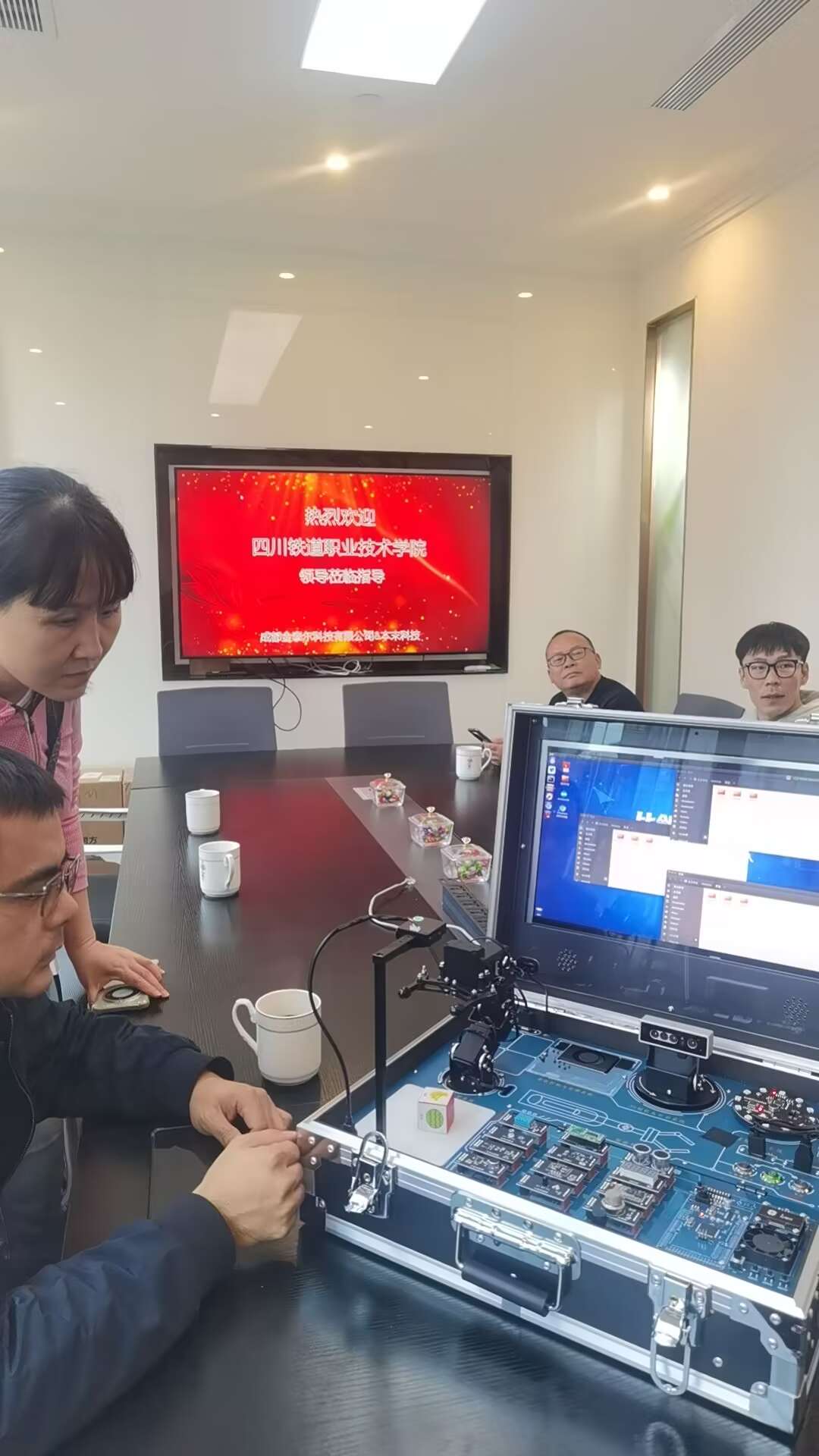 11月4日,铁道工电学院张家骏、汪琪、汪润泽、何柏杉、黄小华、唐玫、杨光7名教师代表,前往成都金泰尔科技发展有限公司围绕机器人与人工智能实验设备进行调研。调研旨在进一步学习智能设备在实验教学中的创新应用,提升学院科研水平,深化校企合作。 金泰尔公司负责人带领教师团队参观了公司的设备展示区,详细介绍了其主营业务、核心产品等情况。金泰尔科技致力于为高校提供先进的教学解决方案,通过现场讲解,教师们对金泰尔的技术实力有了直观了解,并初步构想了将这些智能设备应用于教学的方式。