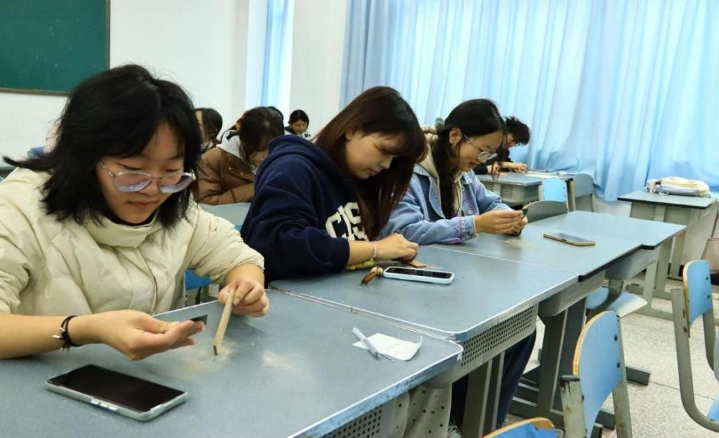 在实操环节,姜老师首先现场演示线锯切割木块的操作技巧与安全规范,邀请五位同学上台实操体验,近距离感受木材加工的工艺细节。全体同学领取木块和砂纸,亲手进行打磨、塑形,感受将粗糙原木变为温润作品的制作过程。打磨完毕后,通过打孔和搭配安装流苏、彩绳等装饰材料,制作独具个性的书签作品。活动现场氛围热烈,同学们相互交流创作思路,在动手实践中锤炼耐心与专注力,深刻体会 “匠心精神” 的内涵所在。