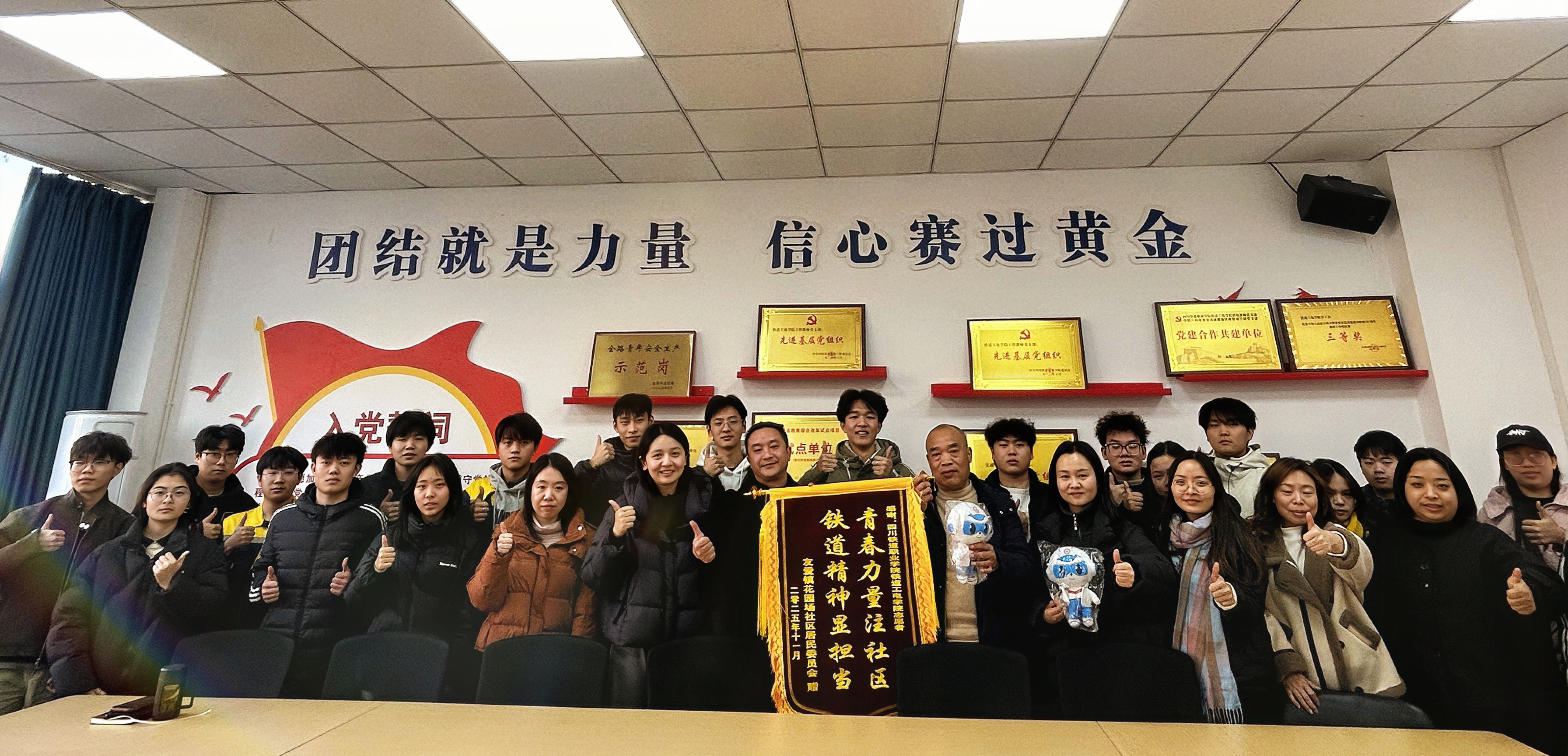 为深化校社协同育人机制,凝聚实践育人合力,2026年1月8日,成都市郫都区友爱镇花园场社区书记李忠毛、副书记张敏领带社区工作人员赴pp电子,为暑期“三下乡”社会实践中表现突出的“川心向党、薪火相传志愿服务宣讲团”与“融绿筑憩实践志愿服务队”铁道工电学院学生服务团队,授予锦旗与志愿者荣誉证书。授旗颁奖仪式在学院第二教学楼2404会议室举行,铁道工电学院党总支副书记董浩、相关志愿团队指导教师、志愿团队成员参加活动。