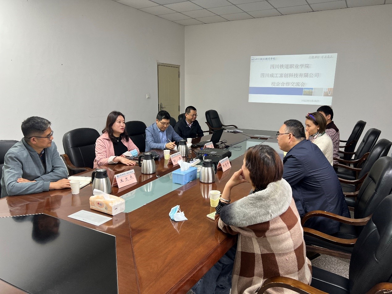 5月18日上午,四川成工富创科技有限公司代吉平总经理一行到校交流,参观了学校铁道综合演练场和城市轨道交通综合实训中心,并就研学基地、科普基地、校企合作等进行了交流。 赖芳校长对代总一行到访表示热烈欢迎,介绍了学校的发展历史、专业办学特色,围绕新修订的《中华人民共和国职业教育法》和“十四五”时期发展规划,就中小学生到校进行研学交流、人才培养、课程开发等方面进行了深入交流。她表示,希望校企双方能够加深彼此了解,把握职业教育发展大好形势,共同承担责任,深入推进产教融合和校企合作,促进双方互利共赢发展。 代吉平总经理介绍了四川成工富创科技有限公司的基本情况,就开展中小学生的科普研学教育、产教融合发展等内容进行了交流。他表示,学校拥有丰富的实训条件,愿意在学生研学活动、校企深入合作等方面开展合作。 城市轨道交通学院相关人员参与座谈。