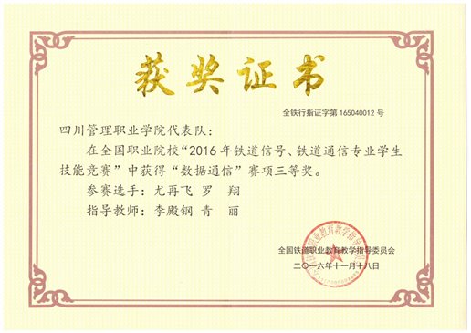 2016年11月15日至18日,我院代表队赴广西壮族自治区柳州市参加第三届全国职业院校“铁道信号、铁道通信专业学生技能竞赛”。此次技能竞赛由全国铁道职业教育教学指导委员会主办,柳州铁道职业技术学院承办,汇聚了来自全国27所铁路院校的78位参赛选手。我院电信工程系通信技术14T1班尤再飞、罗翔同学代表我院参赛,电信工程系李殿刚、青丽老师全程参与指导。经过激烈角逐,我院代表队荣获“数据通信”赛项三等奖。 指导老师和参赛同学为此次竞赛积极准备近半年时间,不怕辛苦,坚持训练,最终取得优异成绩。不仅展现了我院学子良好的专业素养和精神风貌,还拓展了眼界,加强了交流。