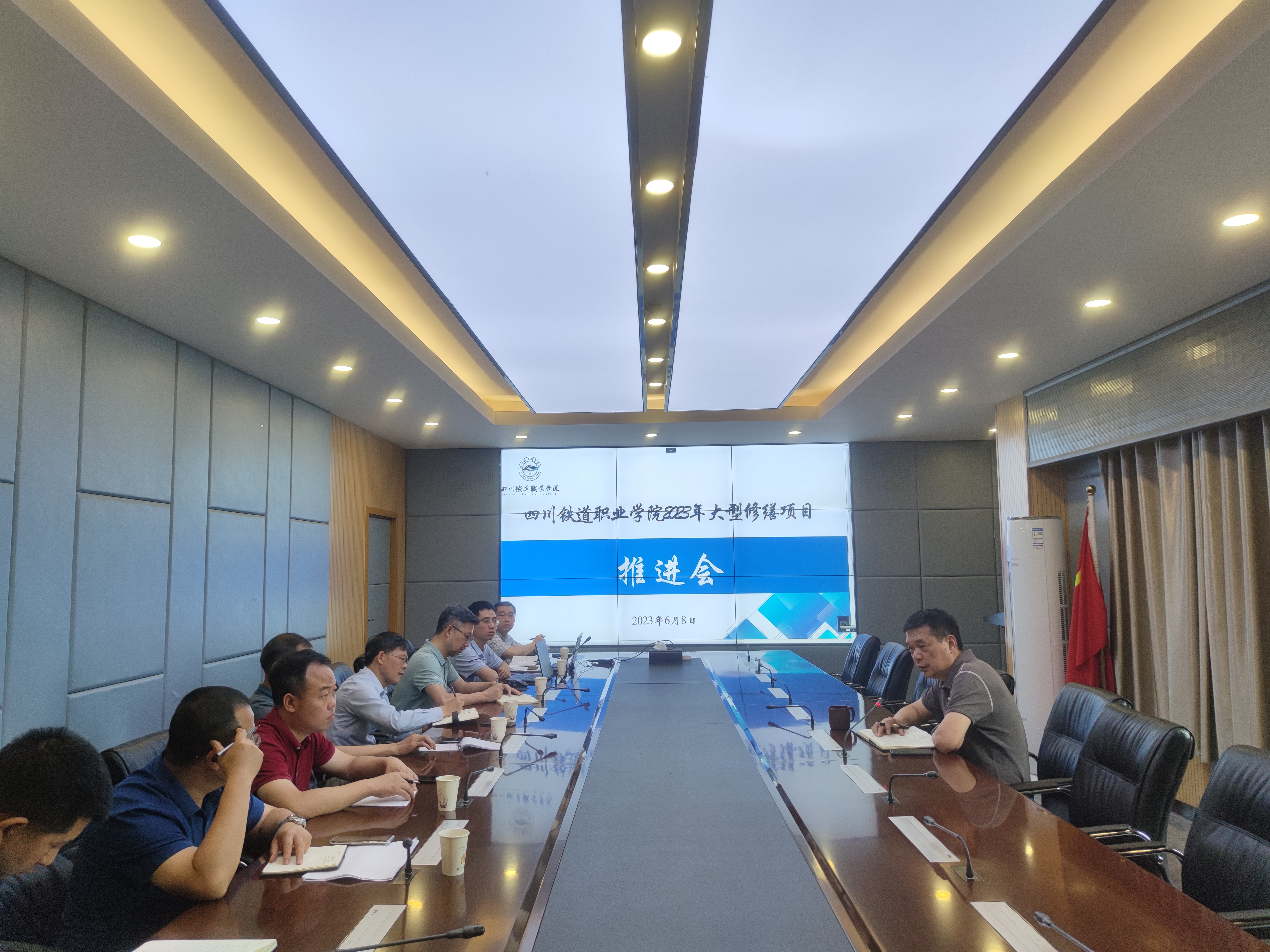 6月8日上午,学校召开了2023年大型修缮项目推进会,副校长黄勇主持会议。计划财务处、科研处、后勤国资处、图书信息中心、基建处负责人参会。 会上,基建处处长马麟介绍了2号配电房至图书馆电缆改造、一食堂操作间改造、多功能交流中心改造三个项目的施工图、清单编制、技术方案。参会人员针对以上内容进行了交流,就重点、难点作了讨论,明确了各项目使用需求和技术指标。 黄勇对项目推进工作逐项给予了指导,提出了具体要求:基建处要按照时间节点完成各项目的施工图、清单编制、招标文件等资料,抓紧开展政采流程,力争月底开标;要总结经验,对后续计划开展的修缮项目提前谋划,细化预算指标内容;要严格按照预算管理办法执行。在后续工作和建设过程中,各部门要通力配合,相互支持;要明确工作职责,保障修缮项目在暑期开工;要加强沟通交流,确保使用效果,共同做好材料进场及验收工作。