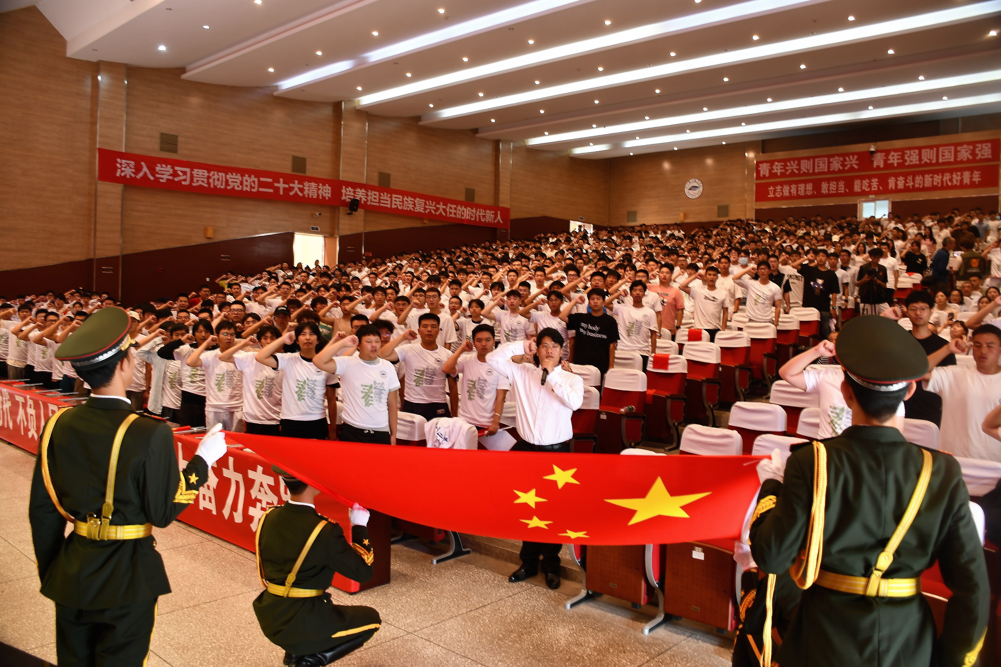 学生代表深情地朗诵《以青春的名义向祖国报告》,用饱满的精神真情告白祖国,告别母校,奔赴前程,满怀崇敬致以青春礼赞,饱含深情对母校许下青春诺言。在全体领导和老师的见证下,铁道工电学院毕业生徐伍瑞带领全体毕业生面向国旗庄严宣誓,立志不负母校期盼,勇为社会栋梁,争做大国工匠。