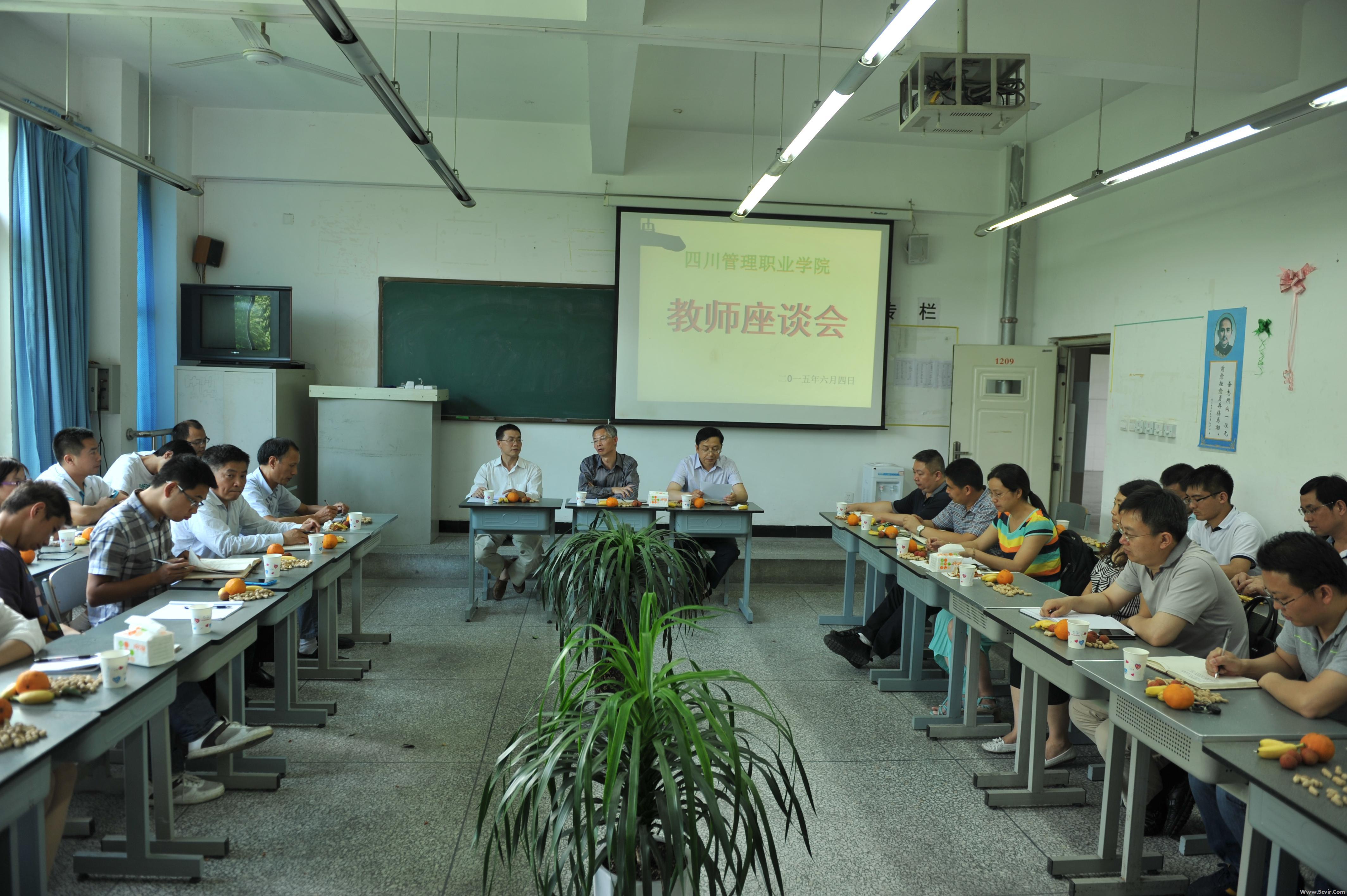 ——教师座谈会侧记 教务处 根据学校《座谈会管理制度》文件要求和本学期关于座谈会的安排,安德校区教务处于2015年06月04日下午16时在1209室举行了2014~2015学年第二学期教师代表座谈会, 学院领导周立院长、易刚副校长及24位教师代表、各系负责人共33人参加了座谈会。会上,教师们积极发言,各抒己见,就学校教学管理工作进行了交流、沟通和探索,特别是在专业人才培养方案、课程标准、微课程、学生上课使用手机、组建专职学生管理团队、小班教学、学生晚自习到图书馆学习等教育教学和教学管理工作提出了宝贵的意见和建议,学院领导就教师们提出的意见和建议作了相应的响应。 最后周院长总结发言,感谢大家中肯的建议,表示对老师们提出的问题,学校会认真加以考虑。同时将自己的电话和QQ联系方式再次留给了大家,希望能得到更多关于学校发展的意见和建议。