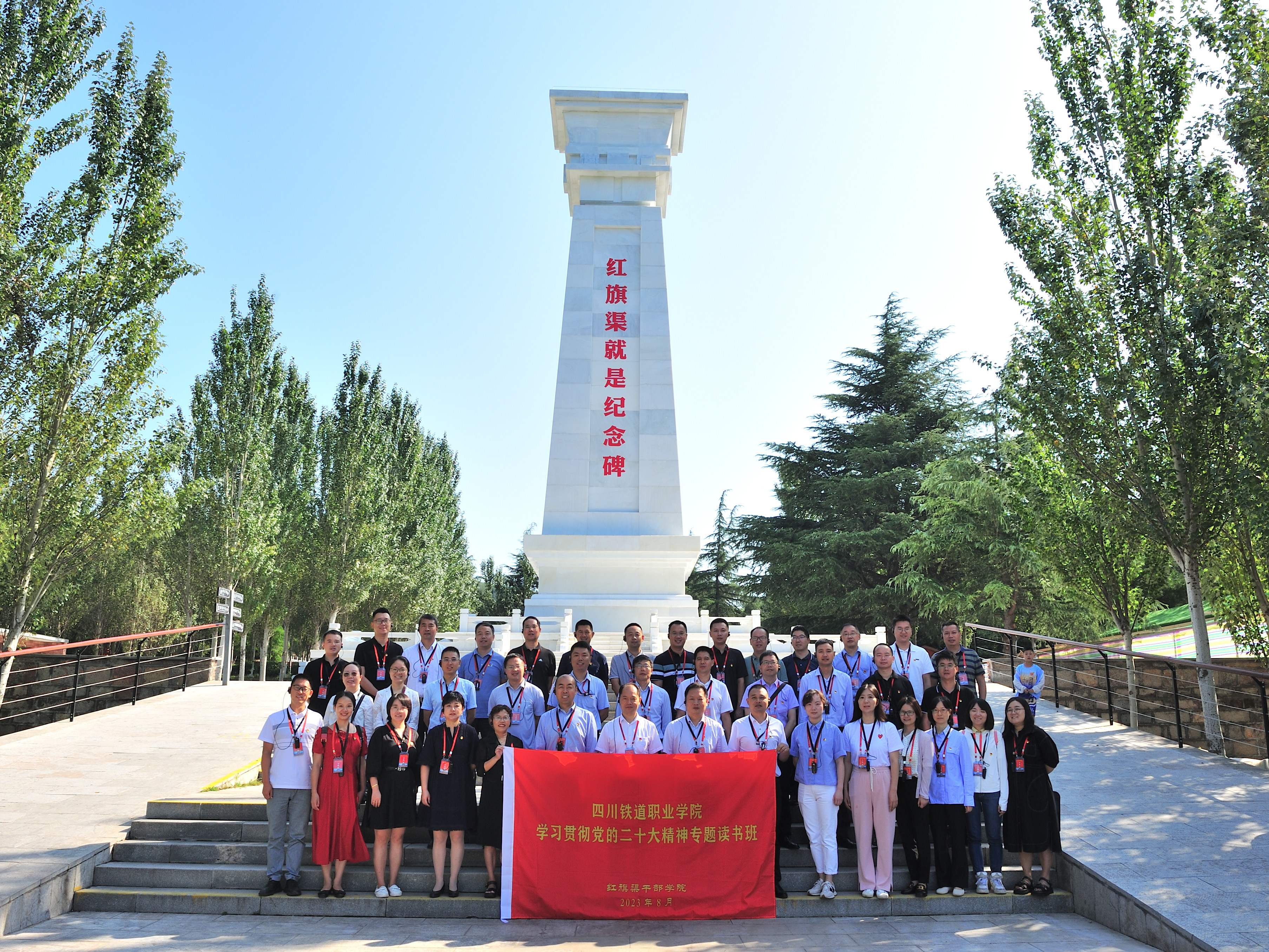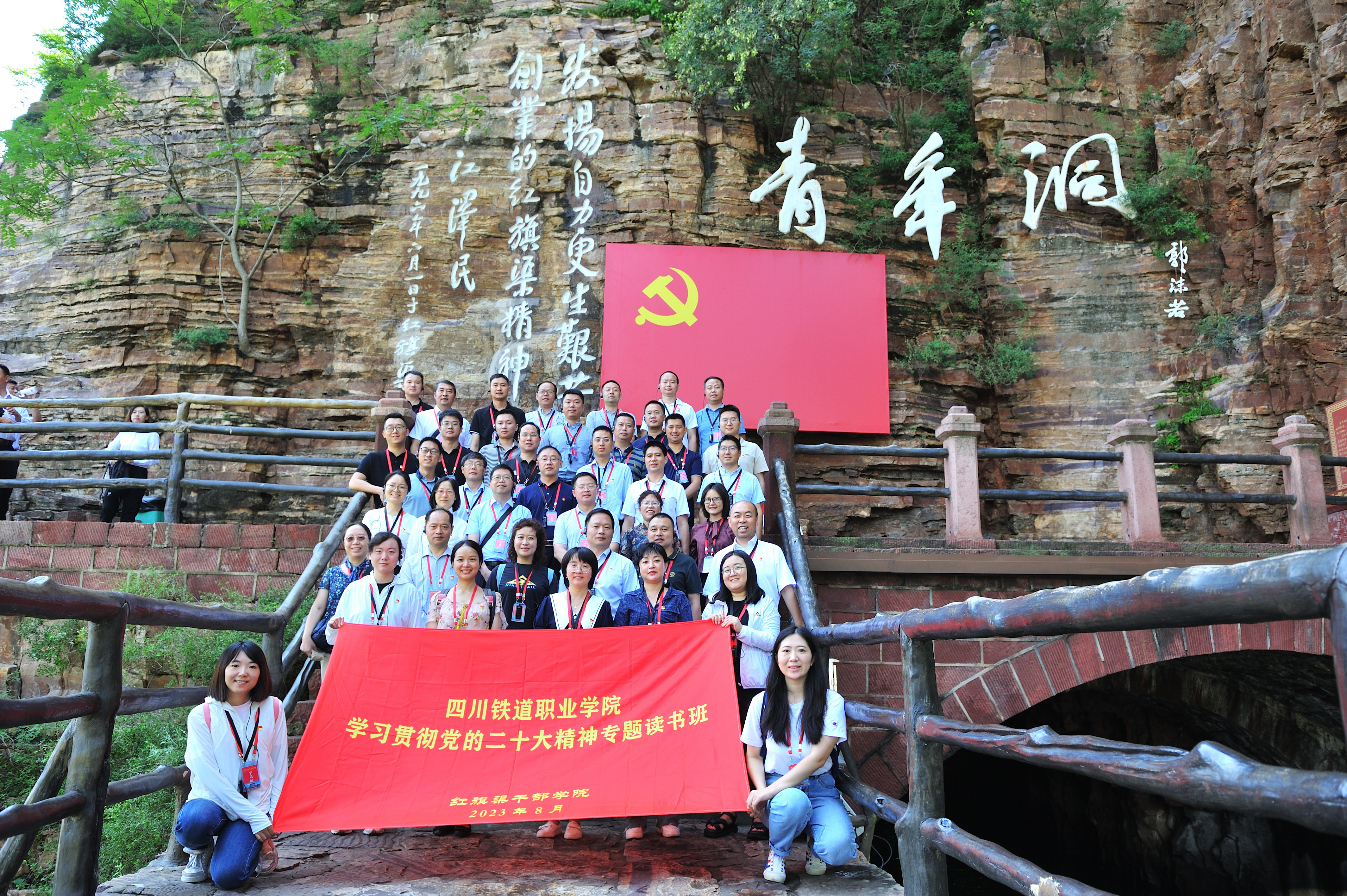 为深入学习贯彻习近平新时代中国特色社会主义思想和党的二十大精神,坚持理论联系实际,加强党员干部的思想淬炼、政治历练、党性锻炼,学校党委举办了学习贯彻党的二十大精神第二期专题读书班。8月28日至9月1日,学校党委副书记、校长赖芳带领读书班学员一行41人赴河南安阳红旗渠开展学习实践,参观红旗渠纪念馆、走千里“水长城”、对话红旗渠建设者和英雄后人、参观马氏庄园、探究殷商文化,庚续传承红旗渠精神,汲取信仰力量。 8月29日,在读书班开班仪式上,赖芳强调,在学习期间,要突出川铁特色、突出学用结合、突出担当作为,推动学校事业高质量发展。她要求,要提高认识,主动学习。把本次读书班作为提升自身精神境界和政治素养的重要契机,全身心投入,主动学习、认真感悟、深入总结,做到学有所思、学有所获。要联系实际,学以致用,将红旗渠精神运用到学校工作中去,坚持为党育人、为国育才的初心使命,努力完成立德树人根本任务。