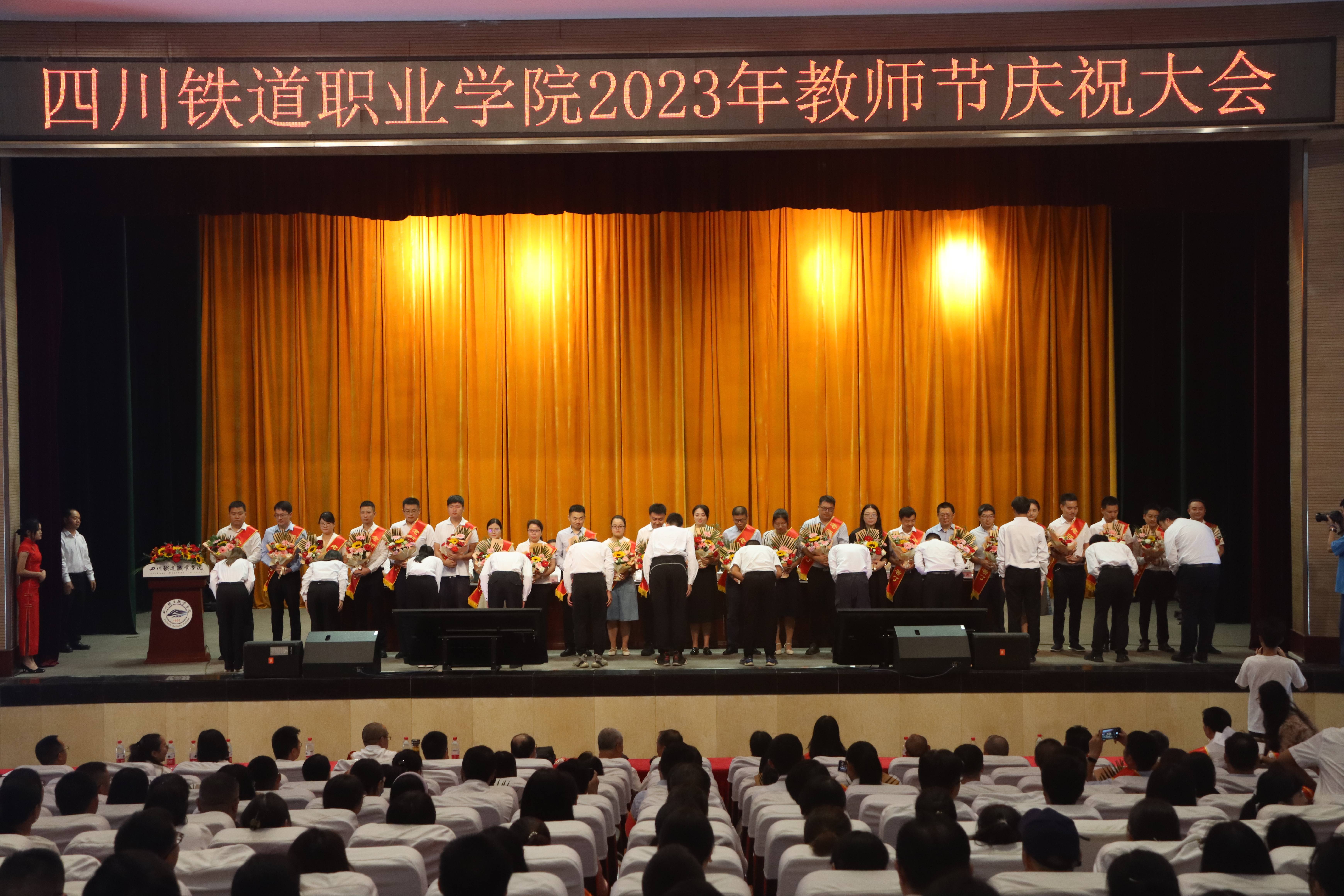9月8日上午,学校全体教职工、荣休教师代表、学生代表欢聚一堂,隆重举行第39个教师节庆祝大会。党委书记贺兆轩出席大会并讲话,党委副书记刘昊君主持大会。 大会在庄严的国歌声中正式拉开帷幕。刘昊君宣读了机车车辆学院获四川省教育工作先进集体的表彰决定,贺兆轩亲自为机车车辆学院颁授奖牌。副校长吴斌宣读了2023年“光荣从教30年”教职工及荣休教职工名单并为他们颁证。副校长黄勇宣读了2023年“30年育人贡献奖”教职工名单并为他们颁奖。副校长黄恩兴宣读了教师获省级以上奖项情况。纪委书记池秋平宣读了教师指导学生获省级以上奖项情况。学生代表为获奖教师和荣休教师敬献了鲜花。