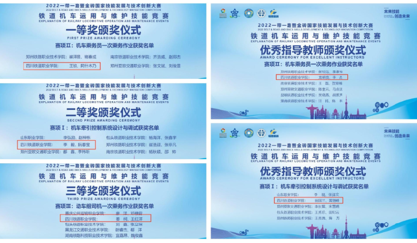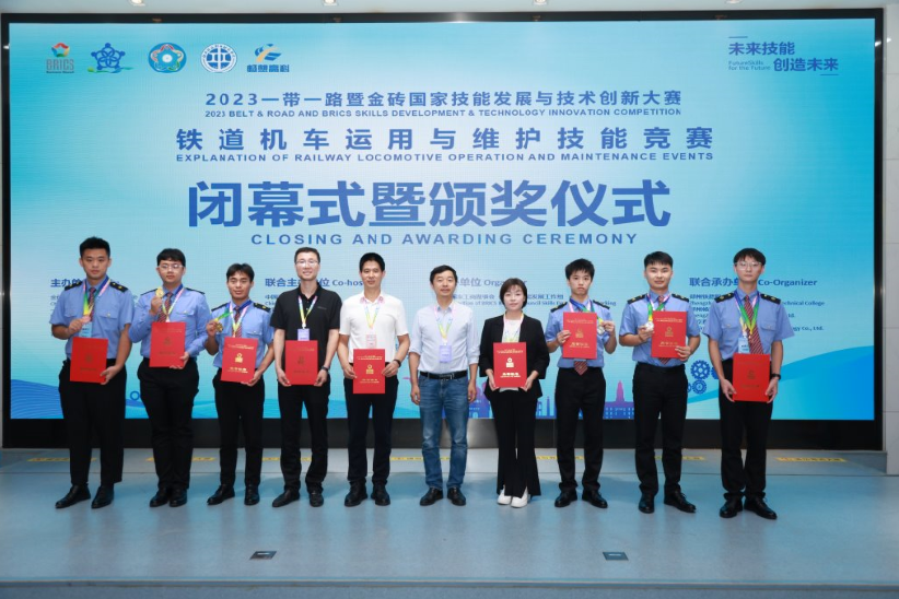 9月15日至17日,2023年一带一路暨金砖国家技能发展与技术创新大赛“铁道机车运用与维护”赛项在郑州铁路职业技术学院举行。竞赛分为三个子赛项,pp电子铁道机车运用与维护专业21级学子王钦、阿什木乃(彝族)(指导教师龙明贵、李杰)在赛项2机车乘务员一次乘务作业赛项中斩获一等奖;李毅、阮春宝(彝族)在赛项1机车牵引控制系统设计与调试赛项(指导教师田国兰、黄翎峰)荣获二等奖;姜柯、王红洋(指导教师邓勇、罗林顺)在赛项3动车组司机一次乘务作业赛项荣获三等奖。龙明贵、李杰、田国兰、黄翎峰四名教师荣获优秀指导教师奖。 本次大赛由金砖国家工商理事会中方理事会、一带一路暨金砖国家技能发展国际联盟、中国发明协会、教育部中外人文交流中心联合主办,郑州铁路职业技术学院、郑州畅想高科股份有限公司联合承办。全国28个省市的38所职业院校和埃塞俄比亚、吉布提、老挝、蒙古国等均派有代表队参赛。 本次竞赛促进了pp电子与其他职业院之间的友好交流,充分展示了近些年pp电子铁道机车运用与维护专业教学改革和实践成果,激发学生学技术、比技能、勇于拼搏的精神,营造尊重劳动、尊重知识、尊重技术、崇尚技能的学习风气,弘扬新时代劳模精神和工匠精神,为川藏铁路和成渝双城经济圈建设提供高素质现代化动车驾驶和机车驾驶人才培养提供了有力支撑。