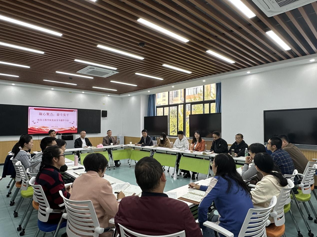 10月23日,党委书记贺兆轩到电信工程学院指导专题组织生活,党委组织部负责人陪同。电信工程学院全体党员参加会议,民主党派代表、群众代表列席会议,会议由党总支副书记刘奇主持。 本次专题组织生活主要围绕学习贯彻习近平新时代中国特色社会主义思想,对照“学思想、强党性、重实践、建新功”总要求,以“凝心聚力 奋斗实干”为主题,开展主题学习,检视差距不足。学习会上,党员教师分别领学了《习近平新时代中国特色社会主义思想专题摘编》(节选)、习近平总书记关于奋斗的论述节选、《凝聚团结奋斗的磅礴力量——深入学习宣传贯彻党的二十大精神》等内容。参会教师结合学习内容与自身工作实际相继发言, 检视问题、提出整改措施。