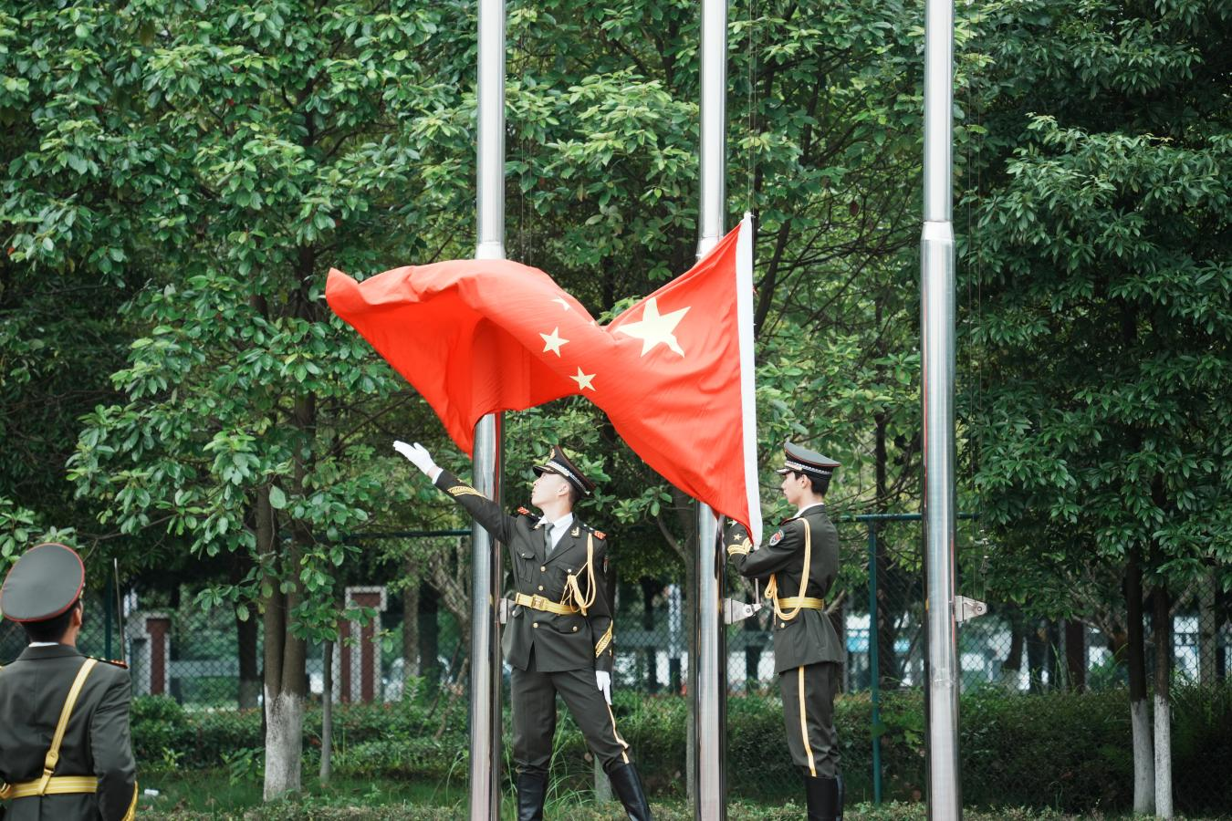 伴随着雄壮的国歌声,五星红旗冉冉升起,2024级新生军训成果汇报暨总结表彰大会正式开始。