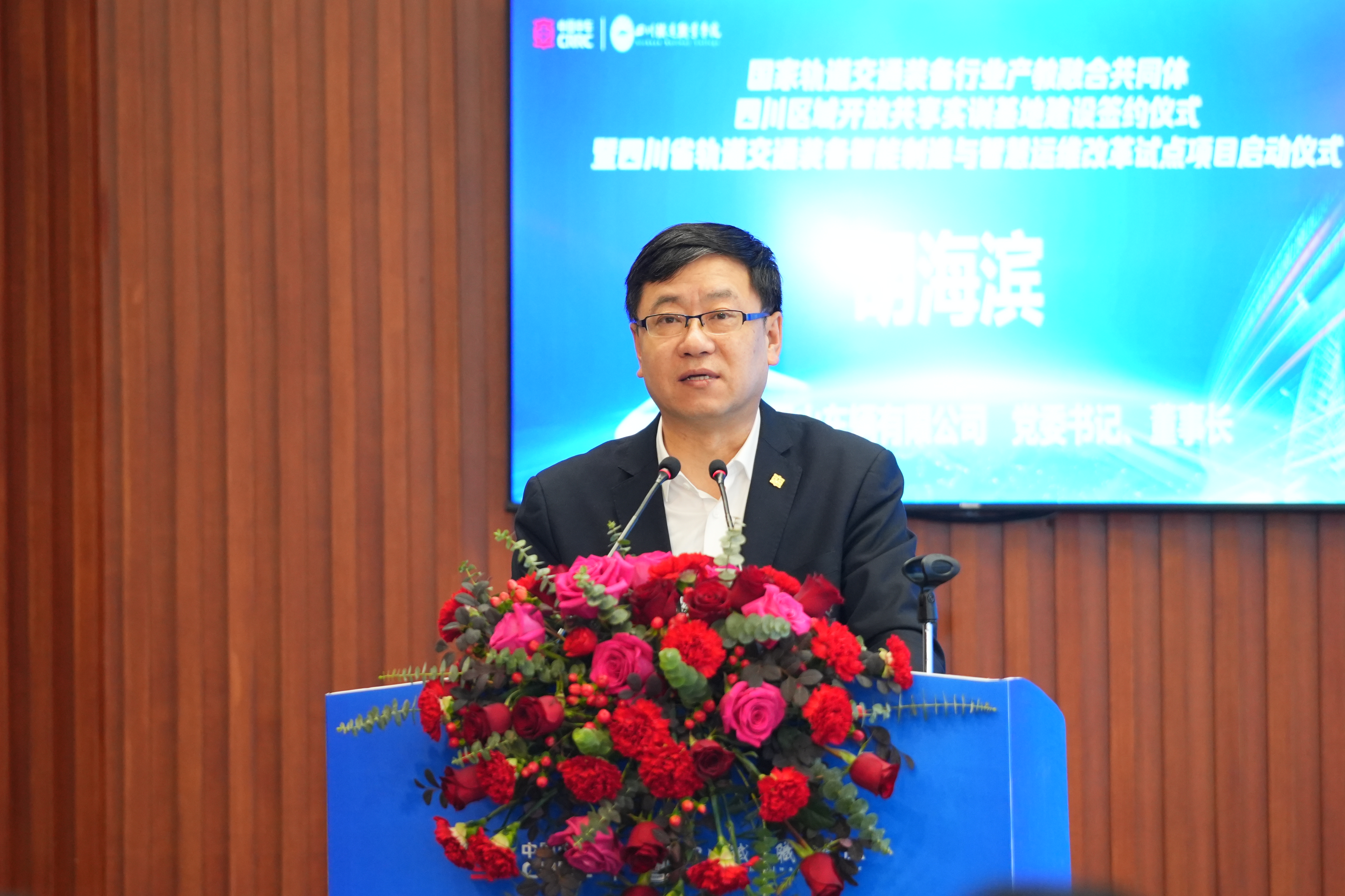中国中车集团有限公司党委委员、工会主席赵虎讲话 赵虎在讲话中指出,国家轨道交通装备行业产教融合共同体是首个国家级行业产教融合共同体,是教育部和中国中车集团共同贯彻落实党中央、国务院关于深化现代职业教育体系改革的重要举措。四川区域开放共享实训基地的签约,对于深化校企合作、促进教育链、人才链与产业链、创新链的有机衔接,具有里程碑重要的意义。希望共享基地的各成员单位同心同向,共创共赢,将实训基地打造为赓续红色基因、传承红色文化的 “示范校”;轨道交通装备行业原创技术的 “策源地”;轨道交通装备行业科技人才的 “孵化园”;推进形成新质生产力的 “动车头”。为轨道交通装备行业的转型升级提供更坚实的人才保障和智力支持。