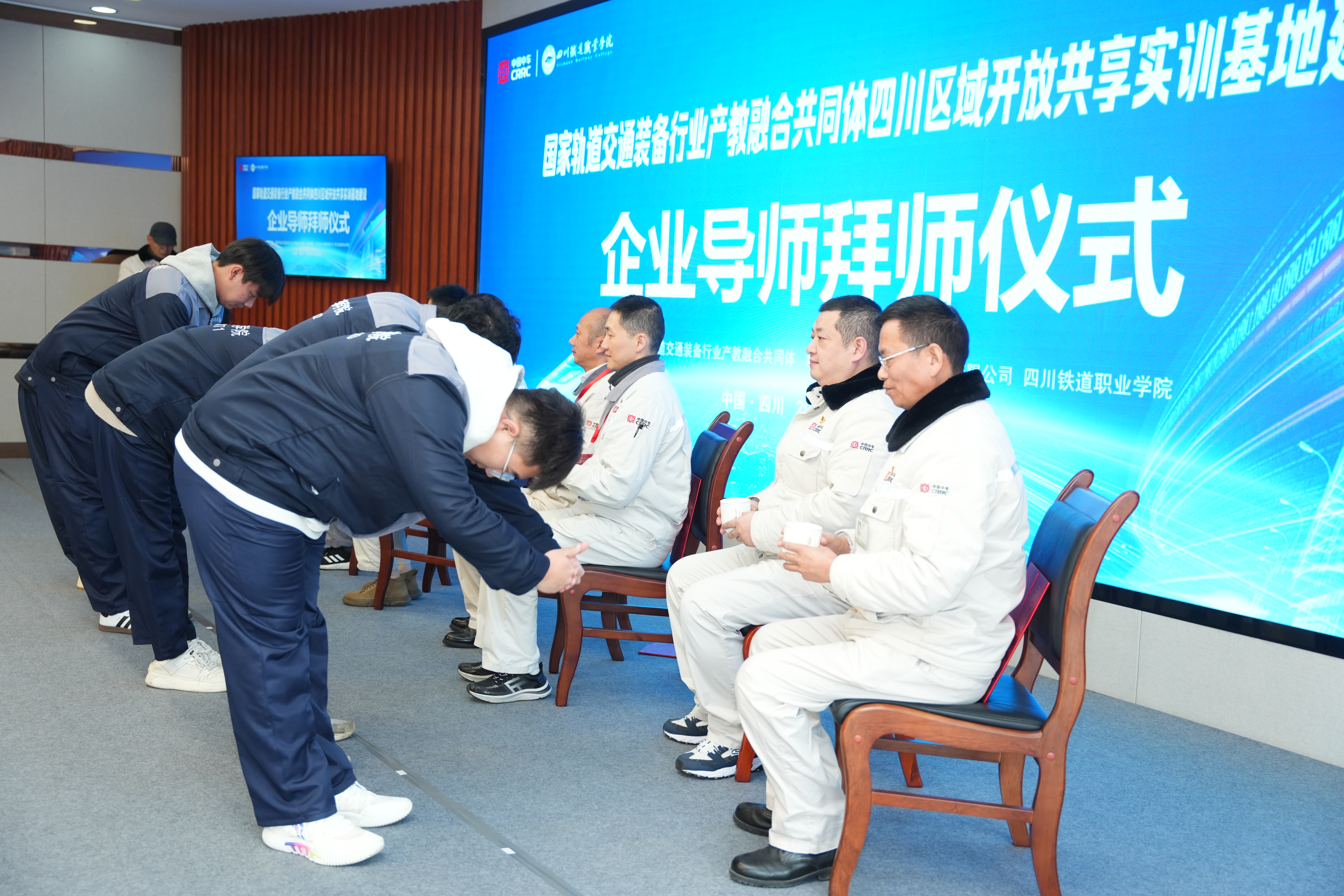 企业导师拜师仪式 签约仪式后,与会领导还为共享基地企业导师颁发聘书,举行现场工程师拜师仪式。 西南交通大学校长助理,峨眉校区党工委书记、管委会主任、共同体副秘书长宋新,中车长江运输设备集团有限公司党委副书记崔洪涛,四川省教育厅职业教育处、四川省经济和信息化厅宣传教育处、眉山市经济和信息化局、眉山市科学技术局、眉山市教育和体育局、眉山市总工会等单位相关负责同志参加会议。签约仪式由中车眉山车辆有限公司副总经理周志强主持。