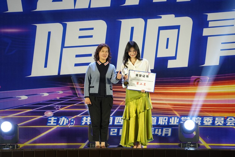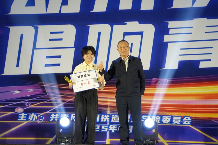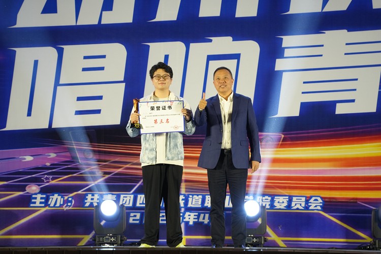 (池秋平为获得第三名的选手颁奖) 此次校园歌手大赛以音符为媒,搭建起青春绽放的舞台,不仅构筑了团员青年展示才艺、互动交流的立体空间,更以艺术共振的形式激发青春正能量,为校园文化生态注入鲜活生命力。未来,学校将持续开展各类文化艺术活动,打造具有川铁特色的校园文化品牌,为新时代青年成长成才厚植文化沃土,助力广大学子在文化育人的丰富实践中实现德智体美劳全面发展。