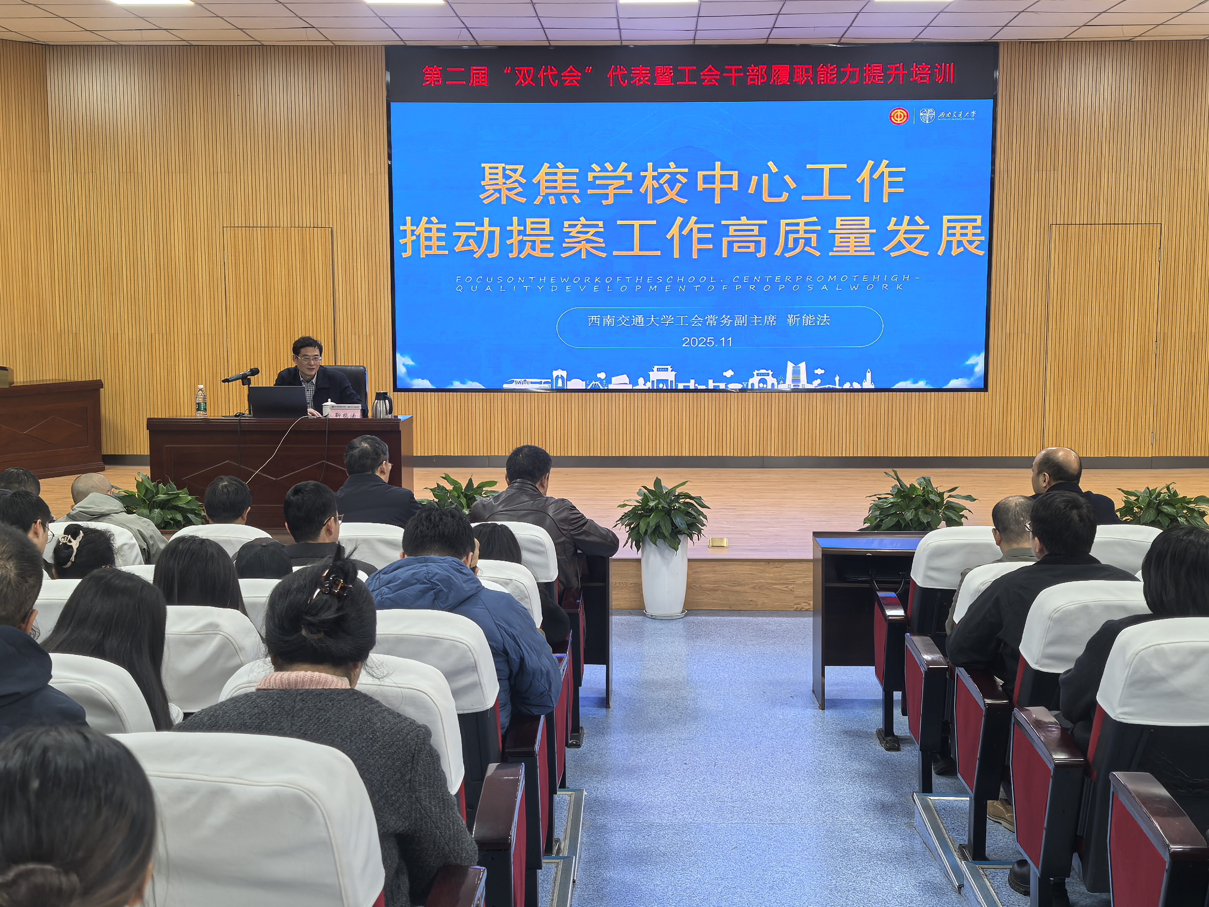 为进一步提升教代会、工代会代表履职能力,切实服务学校高质量发展大局,2025年11月24日下午,校工会在学术报告厅举办第二届“双代会”代表暨工会干部履职能力提升专题培训。本次培训特邀西南交通大学工会常务副主席靳能法作专题讲座。学校党委副书记、工会主席黄勇主持讲座,全体“双代会”代表及工会干部参加学习。