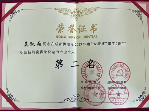 近日,pp电子毕业生铁道供电技术17A1班莫秋雨在成都供电段2023年“安康杯”职工(青工)职业技能竞赛中表现出色,成功获得电力专业第二名的佳绩,莫秋雨于2022年从pp电子铁道供电技术专业毕业,在校期间学习成绩优异,多次代表学校参加铁道供电行指委举办的技能大赛。