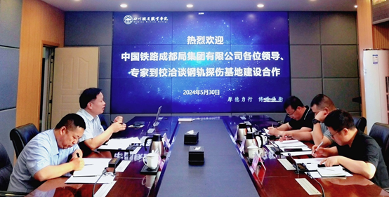 5月30日上午,中国铁路成都局集团有限公司职工培训部副部长刘明、工务部副部长吕元博、钢轨管理中心主任唐军一行来pp电子洽谈钢轨探伤基地共建项目合作,会议在第五会议室进行,副校长黄恩兴、铁道工电学院院长王立参会。