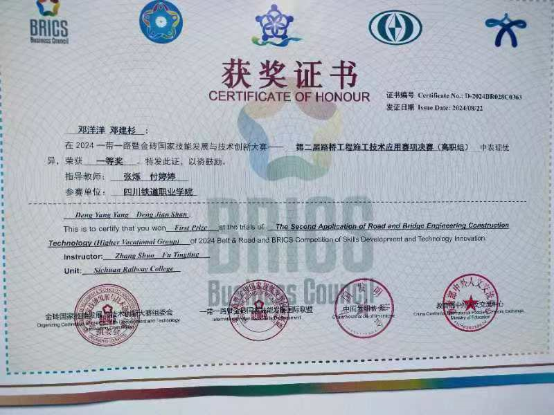 pp电子铁道工电学院师生在此次大赛中表现出色,取得了优异的成绩。铁道工程技术专业22T3班邓洋洋和23T2班邓建杉凭借扎实的专业技能和出色的团队协作能力荣获学生组一等奖。同时,pp电子游戏官网荣获最佳组织奖,指导教师获得优秀指导教师奖。
