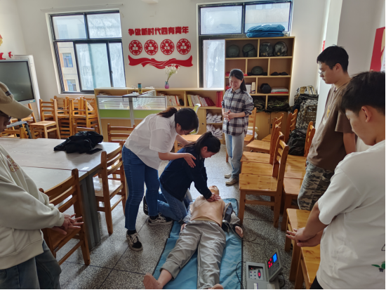 在演示环节,郑丹利用假人,分步骤展示了心肺复苏的正确操作,包括按压位置、频率、深度以及人工呼吸的规范动作。随后,依次指导学生们利用假人进行心肺复苏实操练习,在实操过程中,同学们认真学习,积极参与,通过即时纠错与反复训练,切实掌握了急救技能的要领。