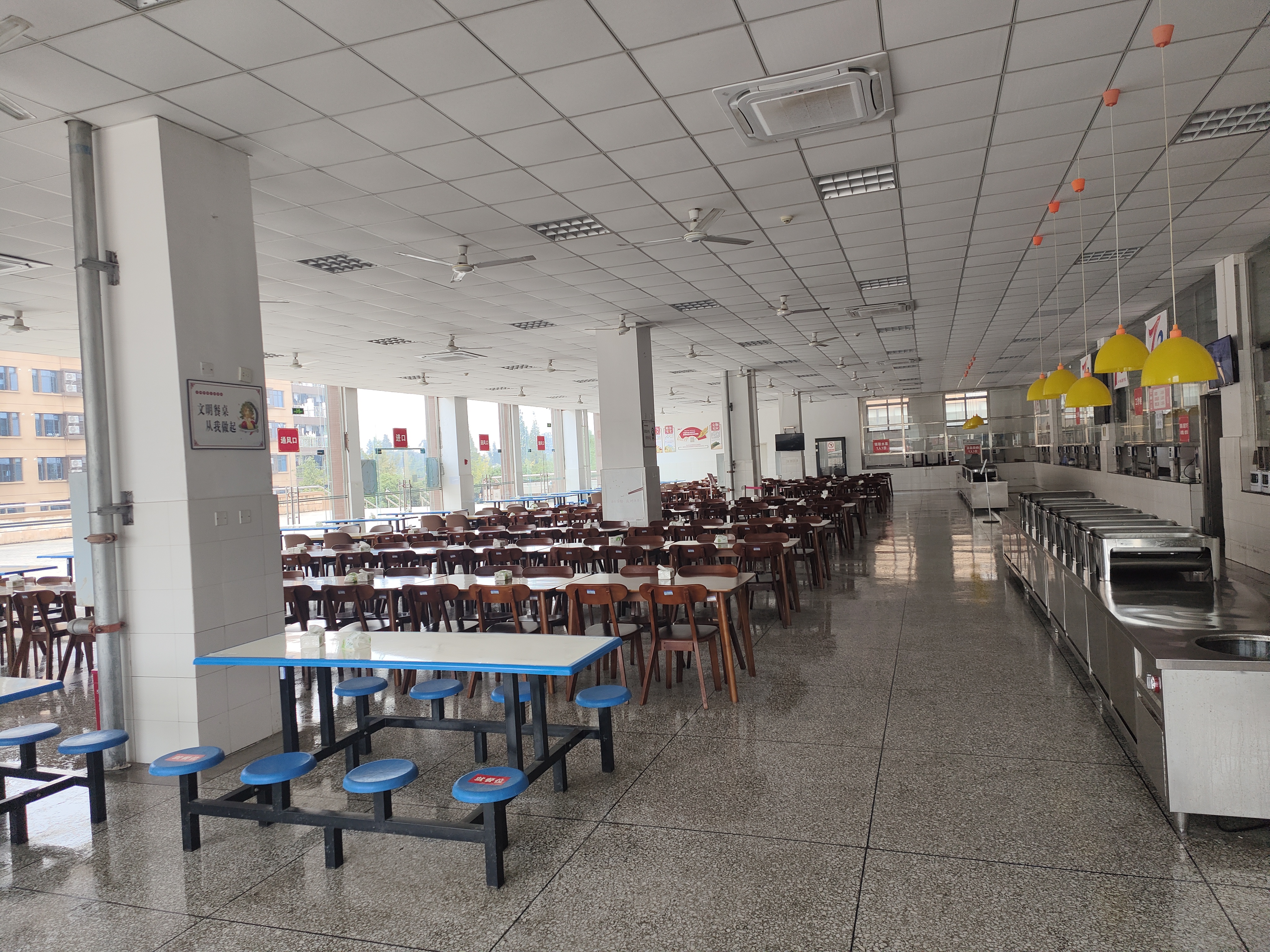 戴璐老师将此次劳动教育分成了三个环节:第一环节:理论教学,主要针对活动安全宣讲,打扫安全、卫生标准对60名新生志愿者进行集中理论教学;第二环节:实践活动,同学们挥汗如雨,激情饱满的投入到扫地、垃圾清理、洒水、固定资产搬移、擦玻璃、擦桌椅、除油渍、拖地、固定资产复位、打扫工具清洗并归类整理的工作中;第三环节:总结反思,卫生检查、评估、总结活动的不足和感受。通过志愿者们的辛勤打扫,两个小时后,食堂清洁明亮、焕然一新。