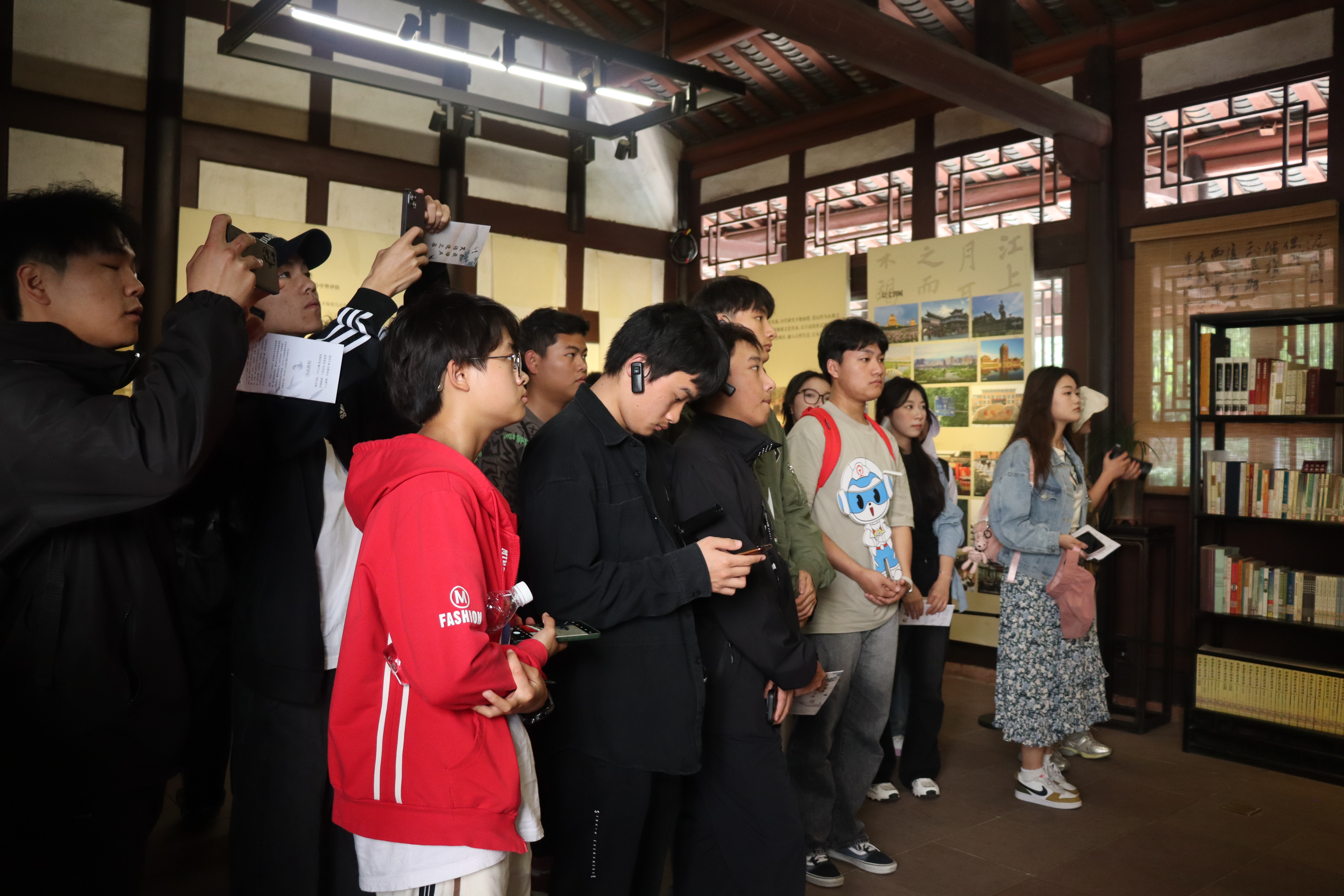 研学活动分为“集体研学—分散调研—交流分享”三个阶段。在讲解员的带领下,师生们沿着习近平总书记的足迹,领悟三苏祠所蕴含的传统文化。在参展过程中,主要参观了“启贤堂”“来凤轩”“式苏轩”等陈展,聆听了三苏的生平事迹、文学成绩以及政治贡献。通过近距离的参展,同学们深刻感悟了“读书正业、慈孝仁爱、非义不取、为政清廉”的苏门家风和“奋厉当世、循理无私、薄己厚人、自洁自好”的苏氏家教。