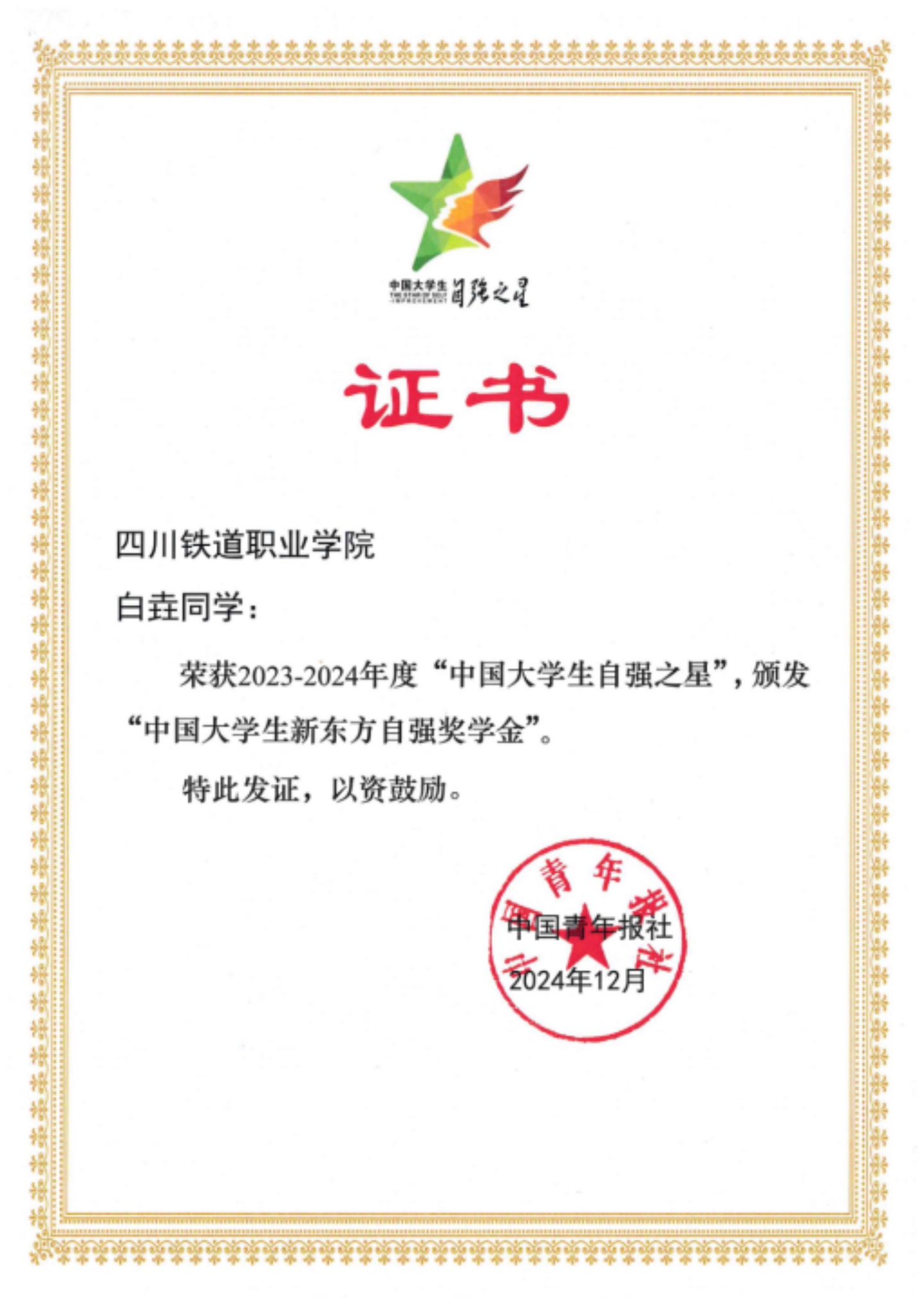近日,由共青团中央、全国学联指导,中国青年报社、新东方教育科技集团、中国青年创业就业基金会联合举办的2023-2024年度“中国大学生自强之星”奖学金评选结果揭晓,pp电子2021级铁道工程技术专业白垚同学荣获2023—2024年度“中国大学生自强之星”称号。