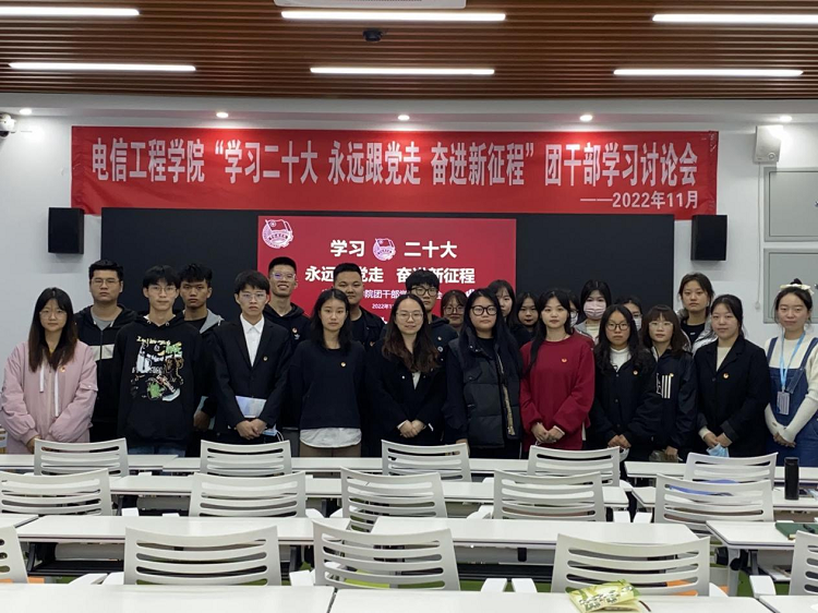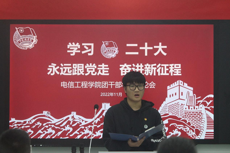2022年10月16日上午,中国共产党第二十次全国代表大会在北京人民大会堂隆重开幕。党的二十大是在全党全国各族人民迈上全面建设社会主义现代化国家新征程、向第二个百年奋斗目标进军的关键时刻召开的一次十分重要的大会。习近平总书记向大会作了报告,这份报告凝聚了全党智慧,制定了全党全国各族人民下一步的行动纲领和大政方针。为深入学习贯彻落实党的二十大精神,坚定不移听党话、跟党走,帮助团学干部立志做有理想敢担当能吃苦肯奋斗的新时代好青年,电信工程学院组织全院团学干部于11月8日在1209教室召开了“学习二十大 永远跟党走 奋进新征程”学习研讨会。会议由学院团总支书记唐宁晓老师主持。