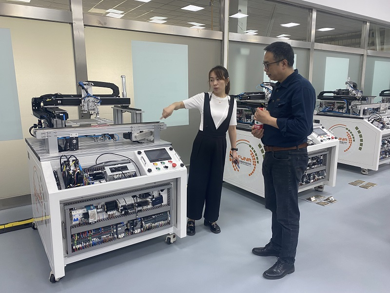 在成都富纳汇科技有限公司,总经理代吉平、产教合作总监张庆热情接待了凌杰一行,陪同参观了公司智能装备展厅及工业装配、工业机器人、智能控制等实训室,凌杰对公司在智能制造方面的成果表示充分肯定与赞扬。