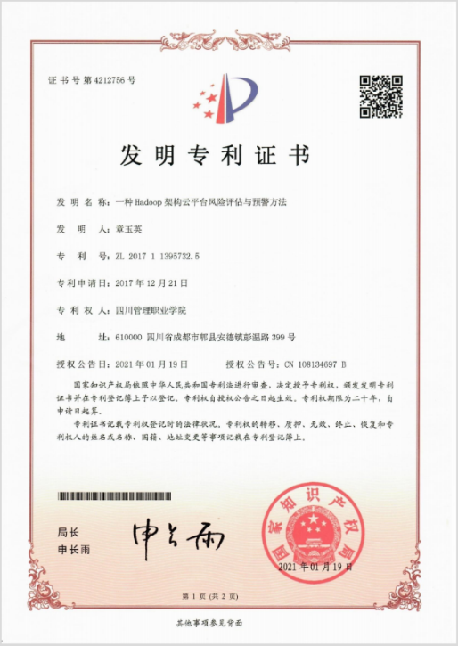 2017年1月,章玉英同志组建了“一种Hadoop架构云平台风险评估与预警方法”的课题研究团队,课题主要针对云计算中存在的安全风险,提出基于风险评估的云平台预警系统解决方法;为有效防止恶意客户使用云端的计算、存储等资源,增强云平台对潜在信任客户端的服务质量,推动云计算在商业上的应用;以信任评估与预警技术为依托,形成基于安全云的预警服务系统。章玉英同志于2017年申报了 “一种Hadoop架构云平台风险评估与预警方法”国家发明专利,同时获国家知识产权局受理。2021年“一种Hadoop架构云平台风险评估与预警方法”获国家知识产权局授权为国家发明专利,专利号:ZL 2017 1 1395732.5。