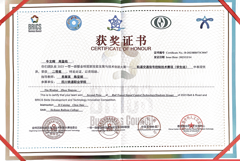 2023年12月14日,2023年第七届“一带一路”暨金砖国家技能发展与技术创新大赛轨道交通信号控制技术赛项全国总决赛在重庆闭幕。经过激烈角逐,pp电子电信工程学院专任教师陈龙、周莹获得教师组一等奖;信号19A1班周盈佑、信号21T3班牛文晖获得学生组二等奖;学校荣获最佳组织奖,指导教师荣获优秀指导教师奖。
