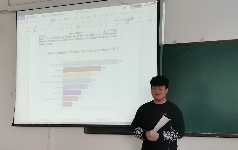 本次比赛针对全校学生进行选拔,由英语教研室何燕、徐萍、姚小菊、周辉、赵雯、郑丽娜六位老师担任评委。比赛以“职场描述”为主题,要求参赛者抽取一幅反映当前热点问题的图片,涉及到春节开支、手机品牌、共享单车等话题,进行3分钟的口头描述和观点阐述。