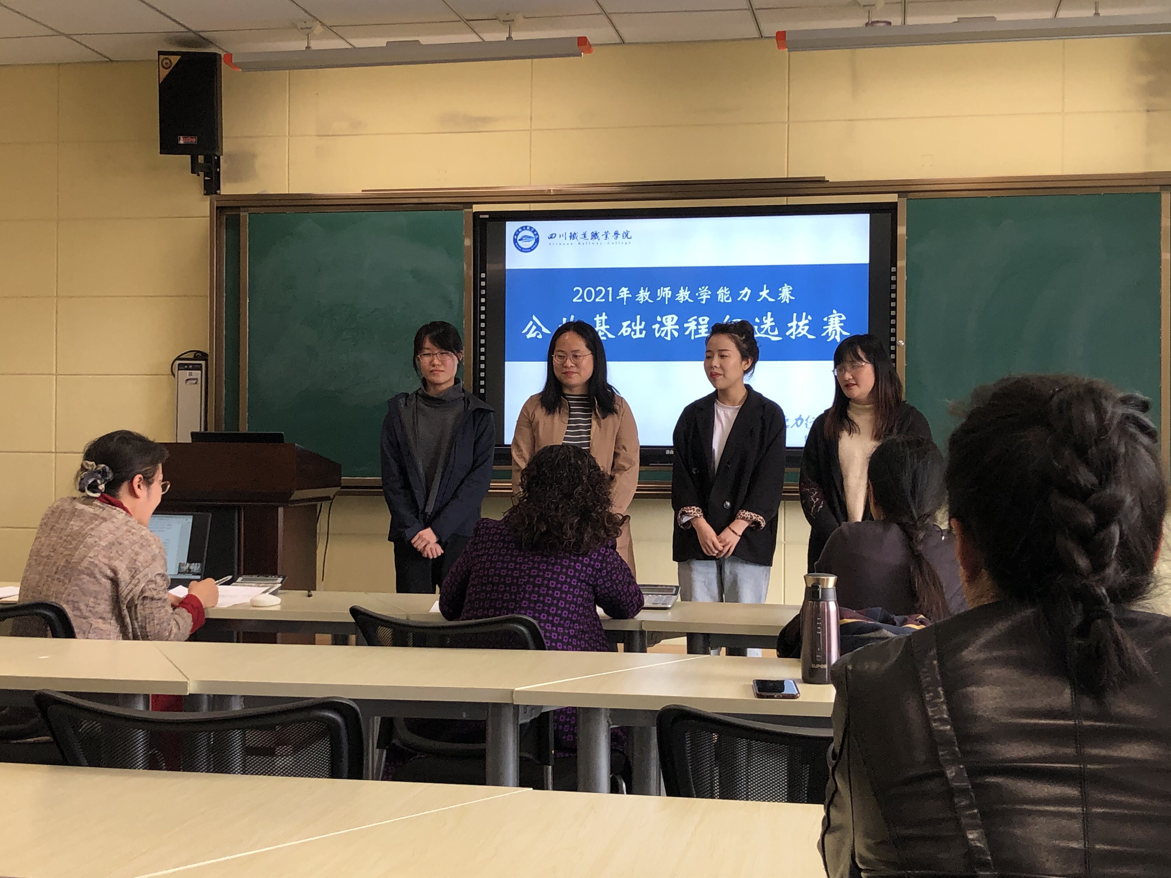 2021年四川省职业院校教师教学能力大赛包括校级比赛、省级初赛和省级决赛。在进入校级比赛前,各系部进行公共基础课程组选拔赛。公共基础课程组选拔赛严格按照相关要求,负责分类组织参赛作品、材料评审,包括内容介绍与教学展示、现场答辩。公教部《高等数学》课程团队和思政部《毛概》课程团队、《心理健康》课程团队三个教学团队进行公共基础课程选拔赛。《国学概论》课程团队因取得2020年四川省职业院校教师教学能力大赛一等奖,直接晋级。各参赛团队汲取部门选拔赛的经验,进一步完善教学实施报告,打磨讲课,从教学方式、教学方法、教学模式、实施手段、课程特色等方面精心设计教学,有机融入职业规范、劳动教育、职业精神等,实现了线上线下混合式教学。针对评委老师的提问,各参赛团队团结协作,认真作答,灵活答辩,阐述对教学设计、教学理念等的理解。赛后,评委老师对参赛团队的综合表现进行了打分。