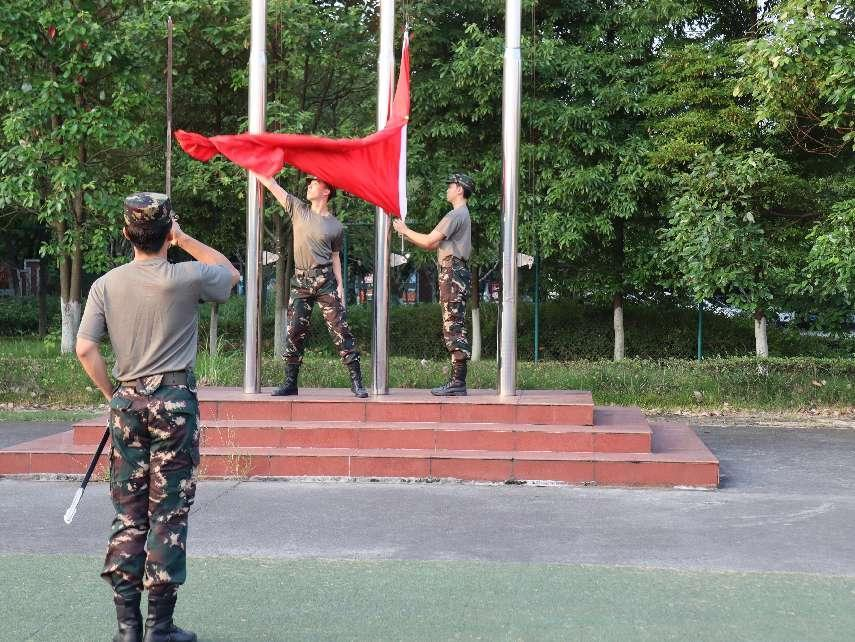 迎着朝阳,国旗护卫队的同学迈着铿锵有力的步伐护送国旗入场,在庄严的国歌声中,五星红旗冉冉升起,全体师生昂首挺胸,肃穆站立,齐唱国歌,向着国旗行注目礼 。
