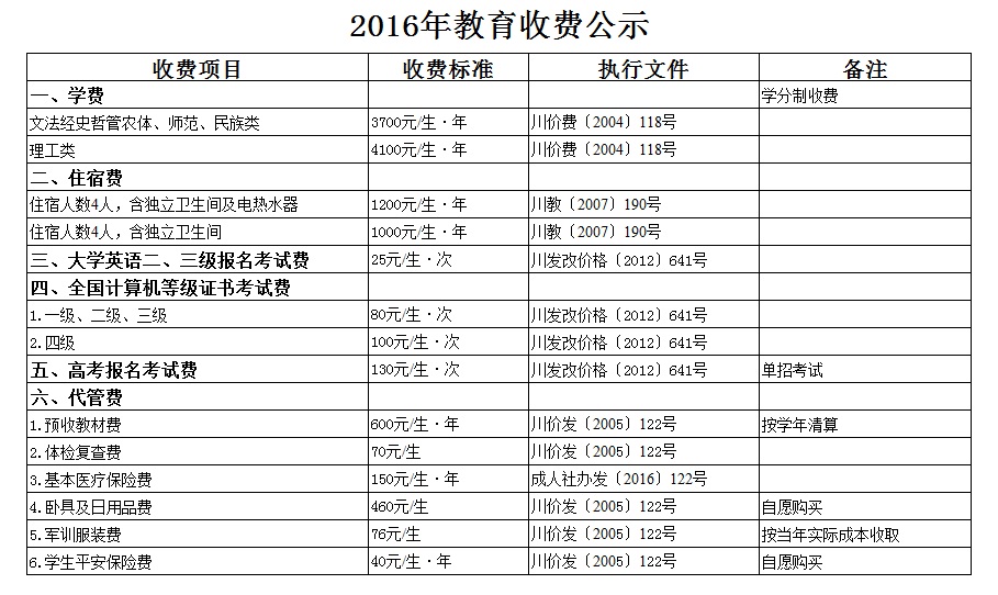 2016年教育收费公示