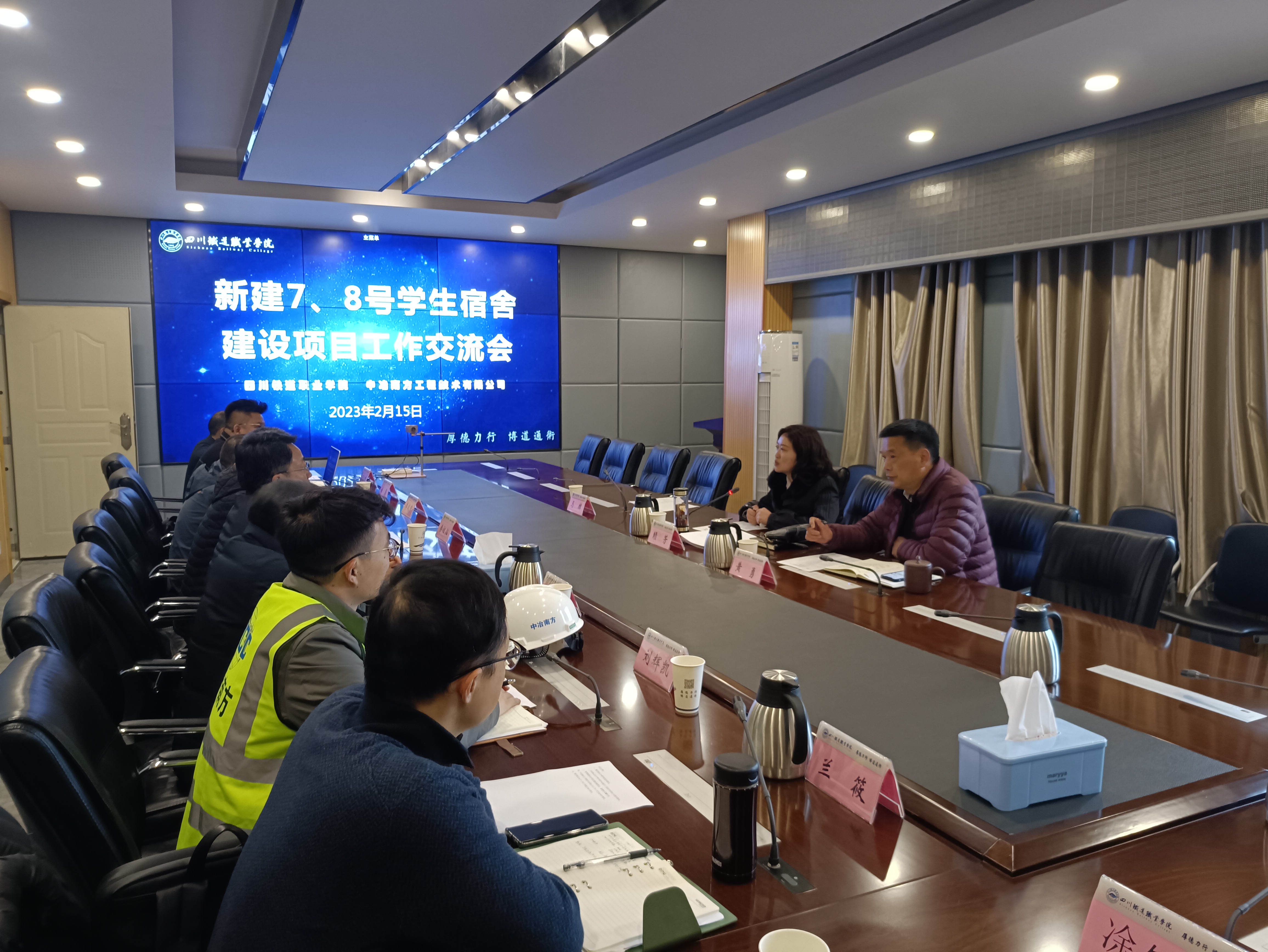 学校基建处处长马麟,中冶南方四川分公司总经理李戍中、副总经理杜磊,中冶南方城建公司总建筑师刁勇、项目管理部负责人凃智敏、造价部负责人兰筱,新建7、8号学生宿舍建设项目负责人蒲尚斌、刘辉凯等参加交流活动。