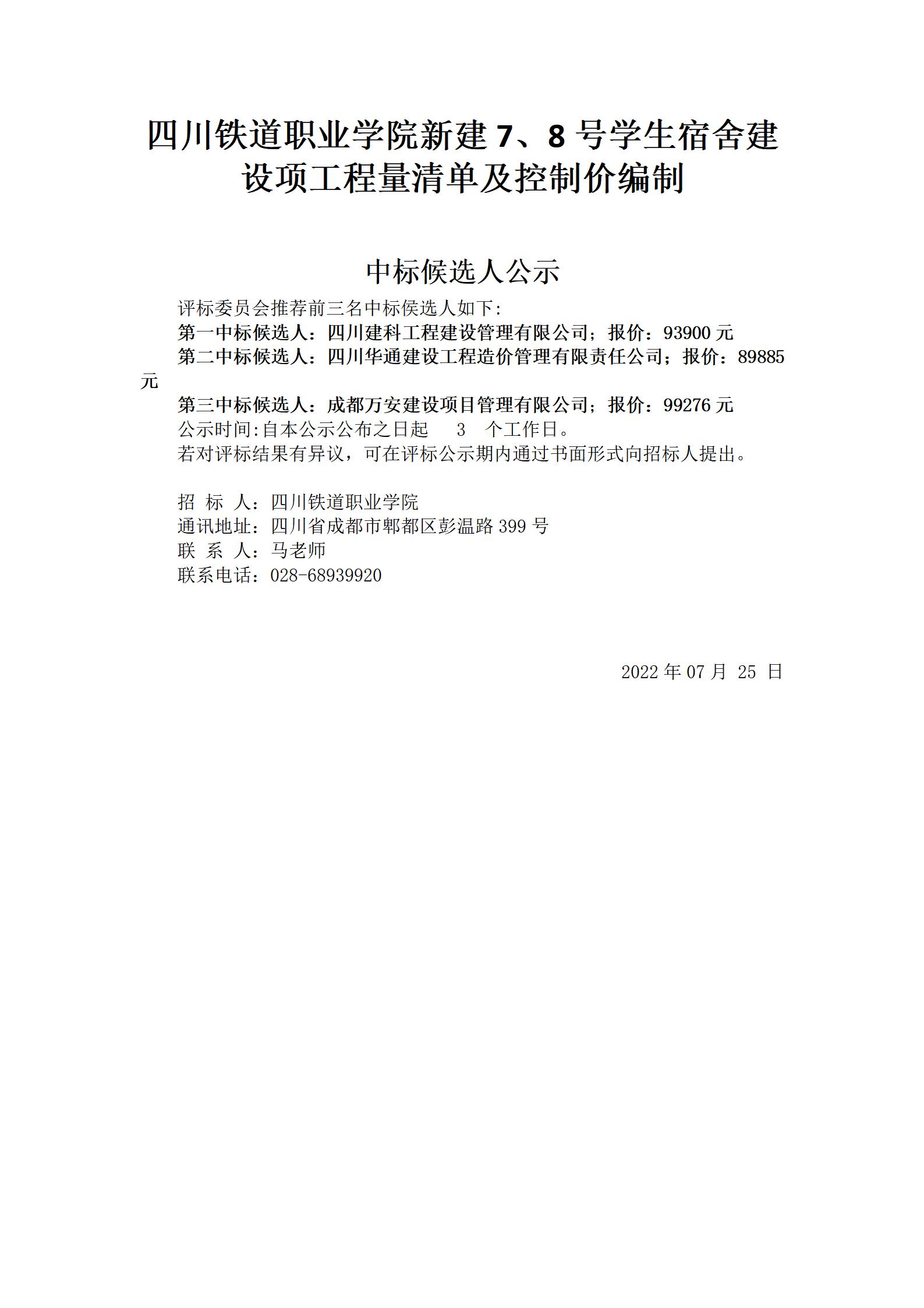 新建7、8号学生宿舍建设项工程量清单及控制价编制公示