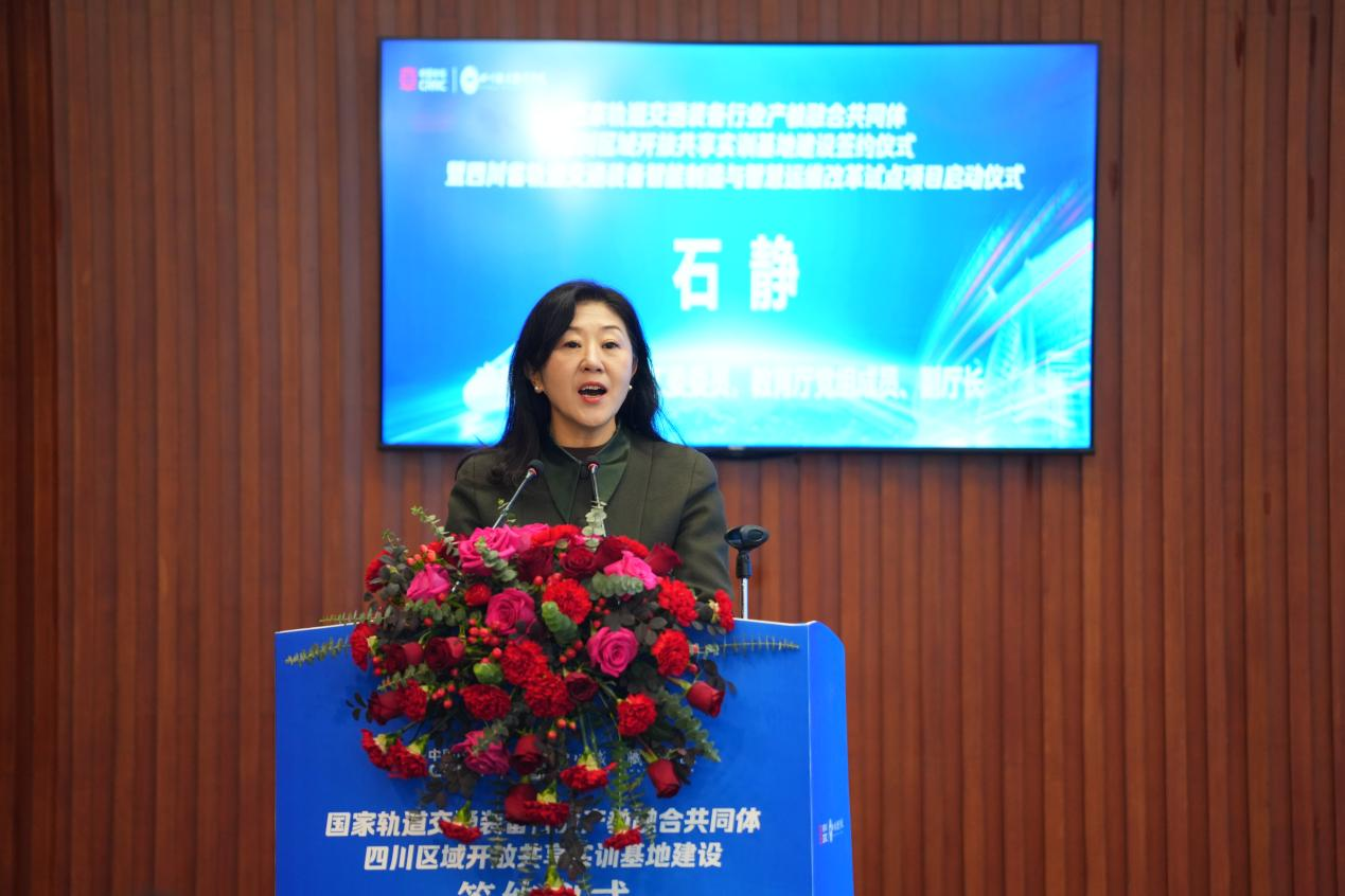 中共四川省委教育工委员、教育厅党组成员、副厅长石静 中共四川省委教育工委委员、教育厅党组成员、副厅长石静出席活动并致辞,代表省教育厅对本次活动的举行表示热烈祝贺。她表示,四川省认真学习贯彻党的二十大精神和习近平总书记关于职业教育的重要指示批示精神,强化政策供给,贯通培养体系,加强内涵建设,深化产教融合,充分调动各方面资源,纵深推进现代职业教育体系建设改革,为区域经济社会高质量发展提供有力支撑。省教育厅将持续关心和支持共同体的工作,积极为共同体的发展创造良好的环境和条件。她希望国家轨道交通装备行业产教融合共同体四川区域开放共享实训基地建设以 “职普融通、产教融合、科教融汇” 为核心理念,汇聚行业产业优质资源、高水平大学的科技人才优势以及职业院校高素质技能人才培养特色,构建产学研用一体化的协同创新体系,为区域社会经济高质量发展提供重要的技术保障和人才支撑,为制造强国、教育强国、科技强国建设作出更大贡献。