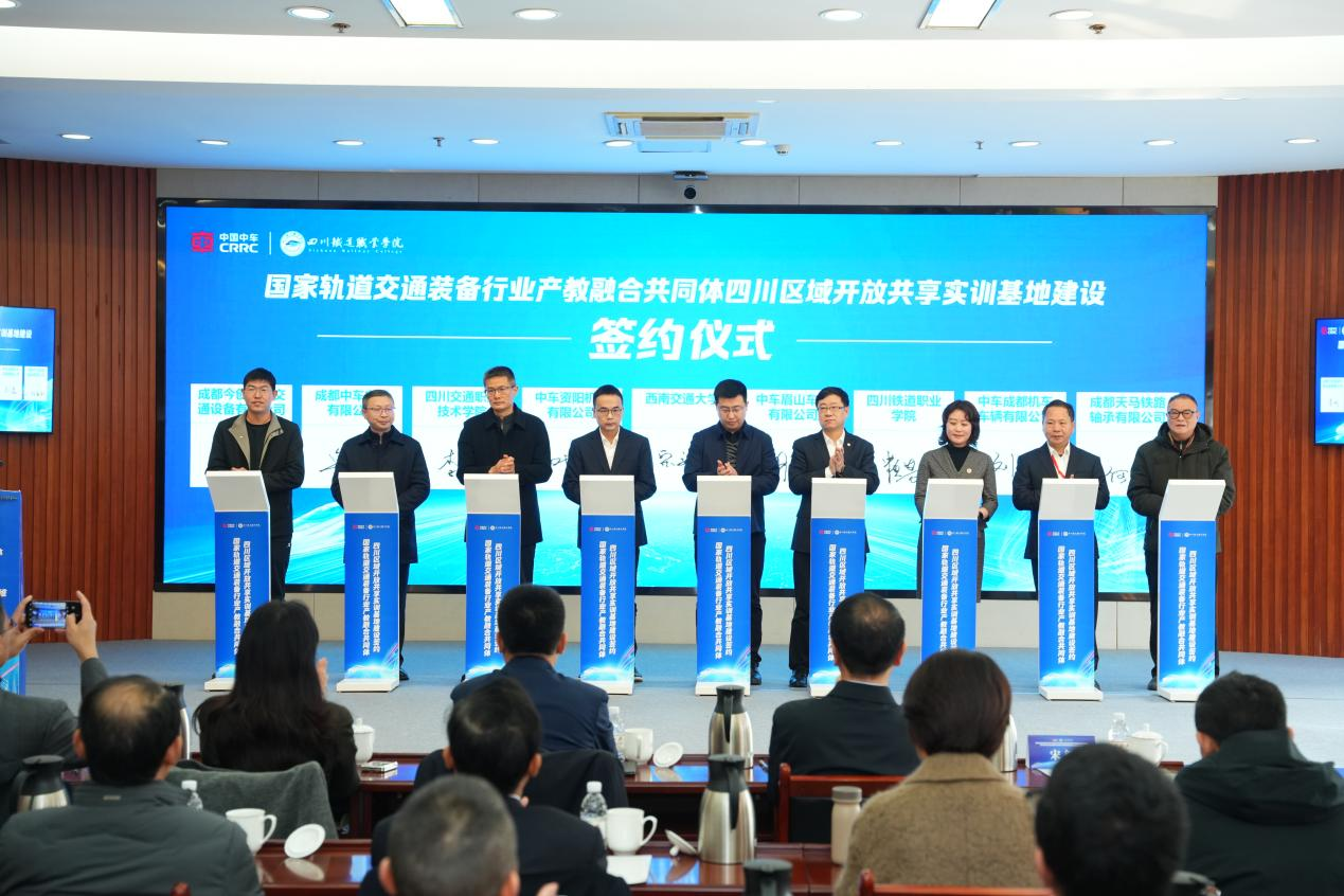 随后,西南交通大学、pp电子游戏官网、四川交通职业技术学院、中车成都机车车辆有限公司、中车眉山车辆有限公司、中车资阳机车有限公司、成都天马铁路轴承有限公司、成都今创轨道交通设备有限公司、成都中车电机有限公司等 9 家国家轨道交通装备行业产教融合共同体四川区域开放共享实训基地共建单位代表上台签约,标志着国家轨道交通装备行业产教融合共同体四川区域开放共享实训基地建设正式启动。