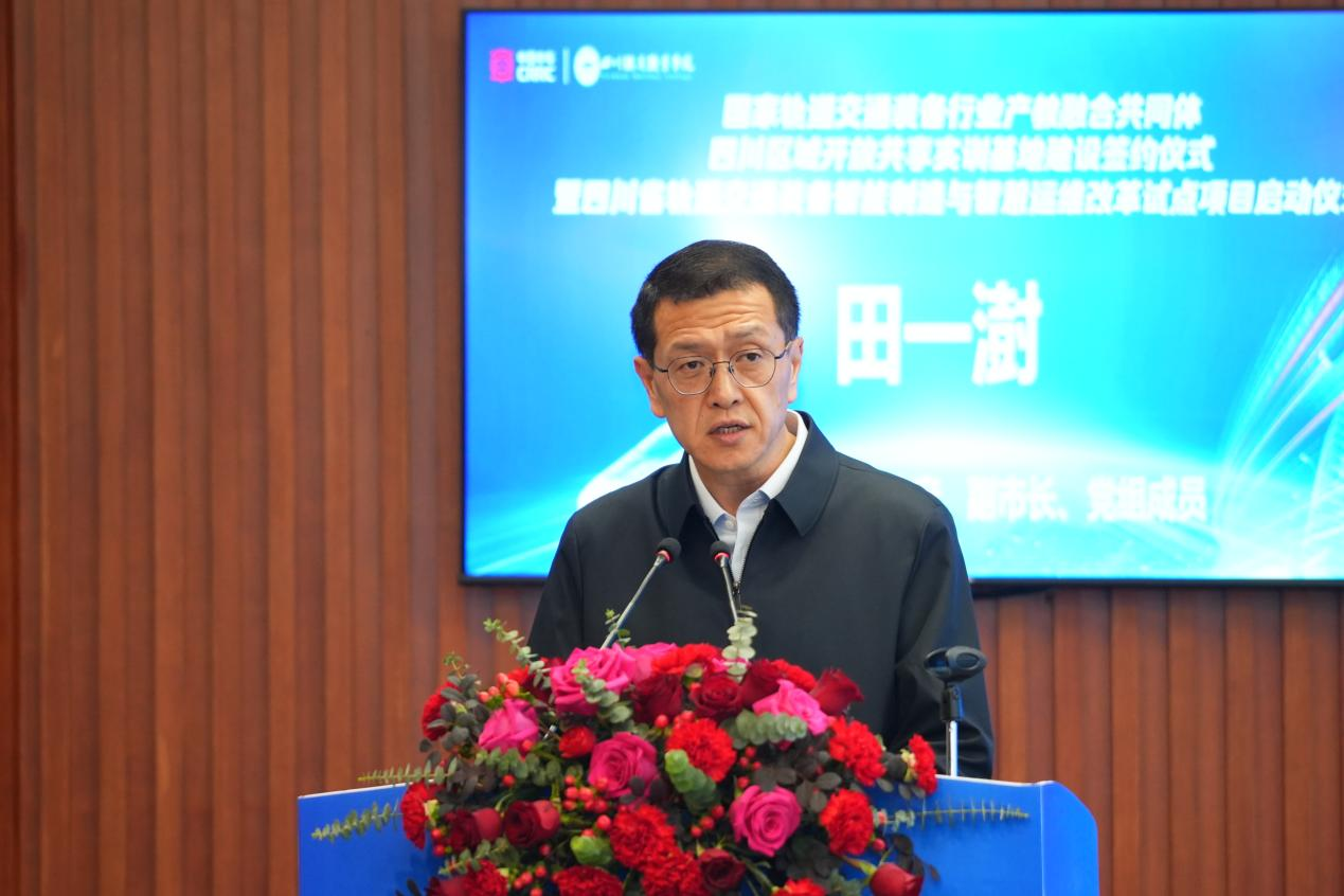 中国中车集团有限公司党委委员、工会主席赵虎出席活动并讲话。他指出,共享基地通过整合中车地方企业的职业教育资源,充分发挥地方高校人才培养与科学研究优势,打造了一系列开放共享的实训基地,这必将成为连接政府、企业、院校的桥梁纽带,推动地方产业和教育资源共享、优势互补、协同发展,优化人才培养结构,提升技术创新能力,为轨道交通装备行业的转型升级提供更坚实的人才保障和智力支持。此次国家轨道交通装备行业产教融合共同体四川区域开放共享实训基地建设签约仪式的举行,对于深化校企合作,促进教育链、人才链与产业链、创新链的有机衔接,具有重要的里程碑意义。他希望四川区域开放共享实训基地建设:一是要打造赓续红色基因、传承红色文化的 “示范校”;二是要打造轨道交通装备行业原创技术的 “策源地”;三是要打造轨道交通装备行业科技人才的 “孵化园”;四是要打造推进形成新质生产力的 “动车头”。
