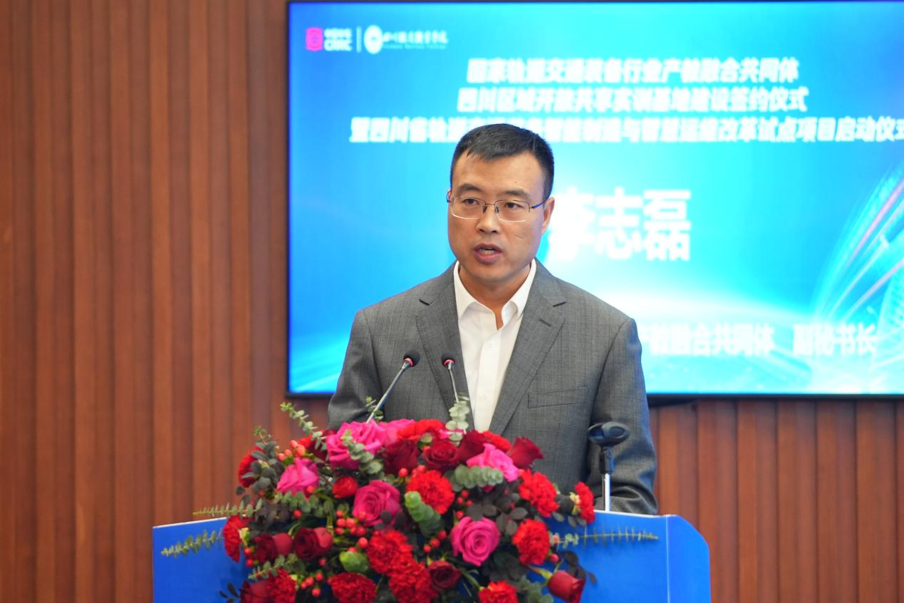 国家轨道交通装备行业产教融合共同体常务理事会秘书处副秘书长李志磊 国家轨道交通装备行业产教融合共同体常务理事会秘书处副秘书长李志磊代表共同体单位致辞。他表示,国家轨道交通装备行业产教融合共同体现由中国中车集团及 58 家产业链企业、9 所普通高校、38 所职业院校共 106 家理事单位组成。一年多来,共同体聚焦职业教育 “五金” 新基建,先行先试、边破边立,探索形成以 “同心同向、共创共赢” 为价值观,以打基础、提能力、树标杆 “三步走” 为实施方略,以教材开发、实训基地建设、随企出海 “品字形” 工作布局为重点突破的 “双同双共、三步一品” 行业共同体建设模式,为轨道交通装备行业加快发展新质生产力奠定了人才根基。他希望共同体四川区域开放共享实训基地建设加快推进,为全力打造轨道交通装备行业产教融合共同体标杆示范,夯实轨道交通装备行业加快发展新质生产力人才根基作出应有贡献。