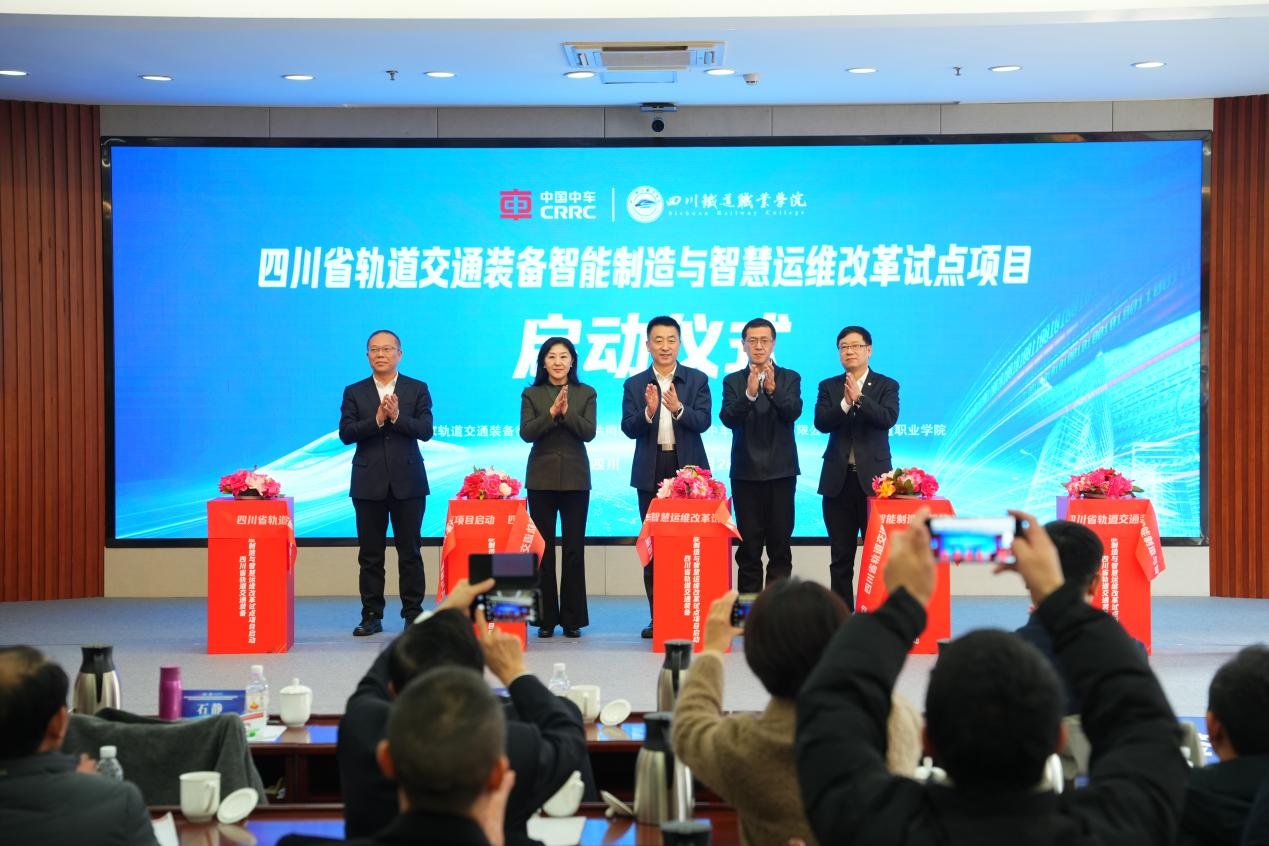 中国中车集团有限公司党委委员、工会主席赵虎,中共四川省委教育工委委员、教育厅党组成员、副厅长石静,眉山市人民政府党组成员、副市长田一澍,pp电子游戏官网党委书记贺兆轩,中车眉山车辆有限公司党委书记、董事长胡海滨共同为四川省轨道交通装备智能制造与智慧运维产教融合改革试点项目正式启动剪彩。