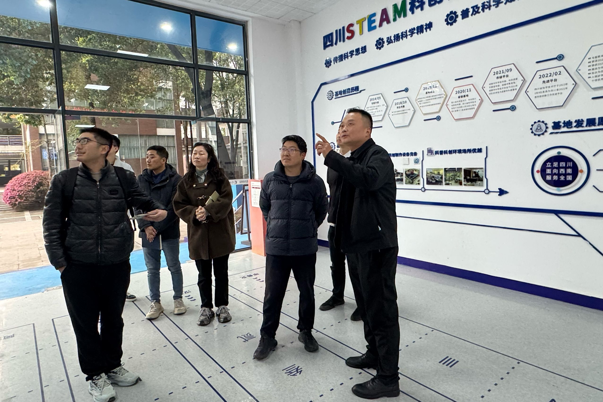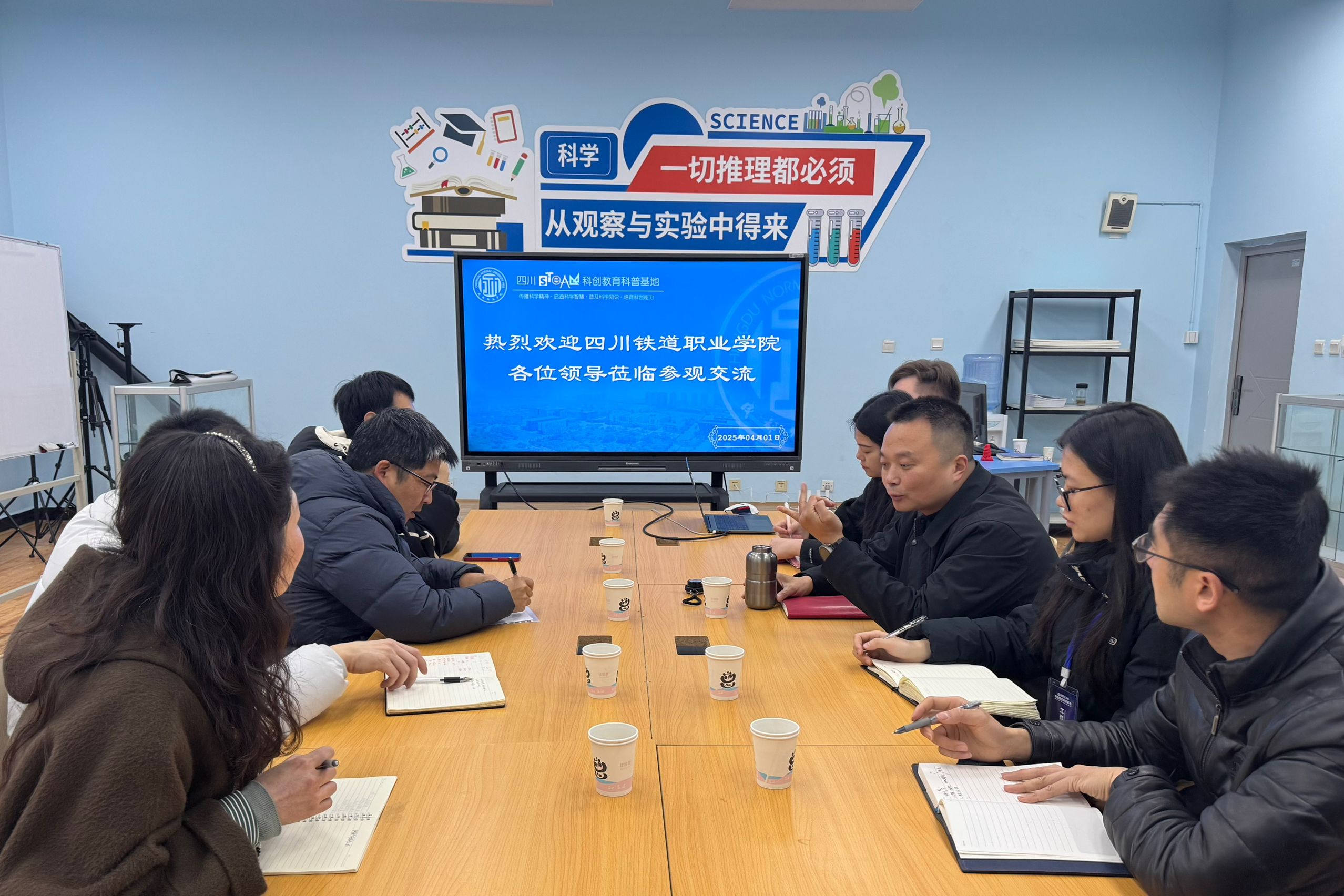 为推动职业院校科创教育发展,深化产教融合,提升学校在机器人、无人机等新兴领域的教学与实践水平,学习前沿科创教育经验,探索合作契机,2025年4月1日,城市轨道交通学院院长杨凤带队,教务处、继续教育中心、二级学院相关工作教师代表一同前往成都师范学院四川 STEAM 科创教育科普基地开展调研交流活动。四川 STEAM 科创教育科普基地负责人袁颖一行参加交流活动。