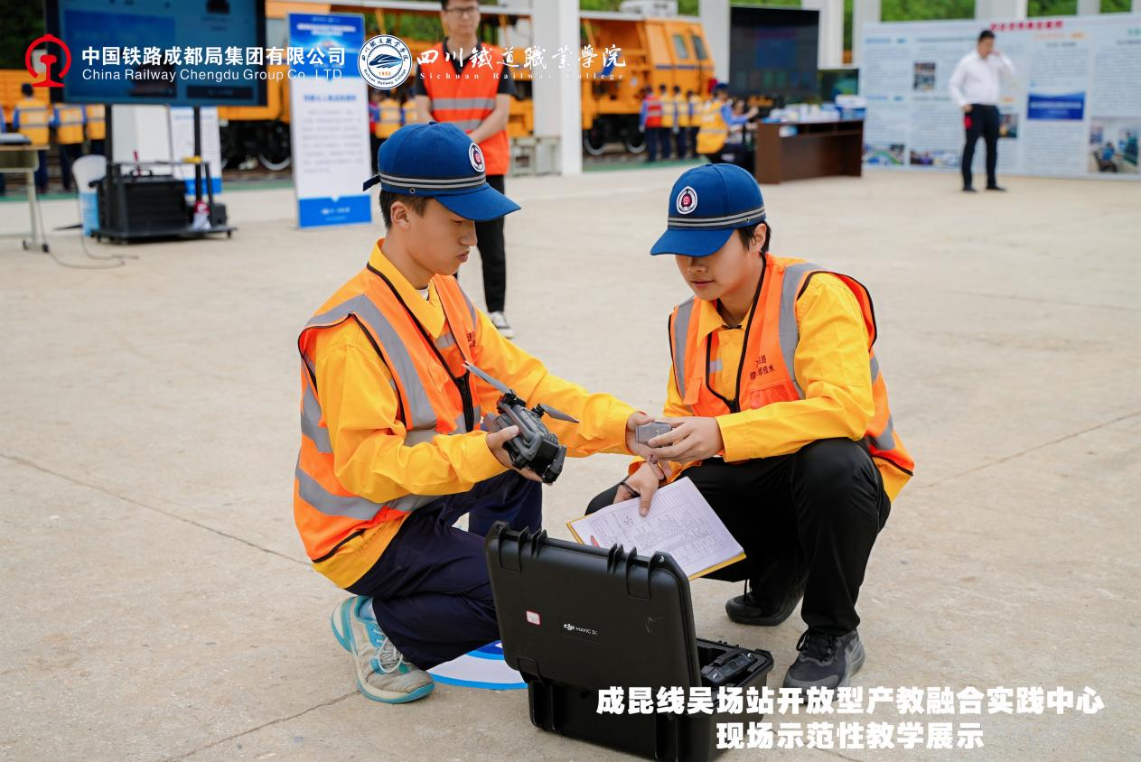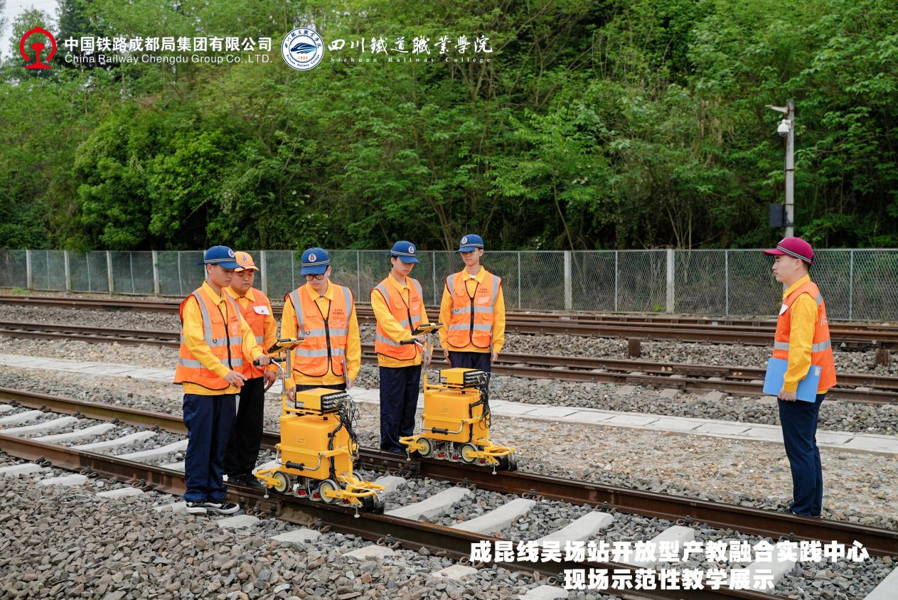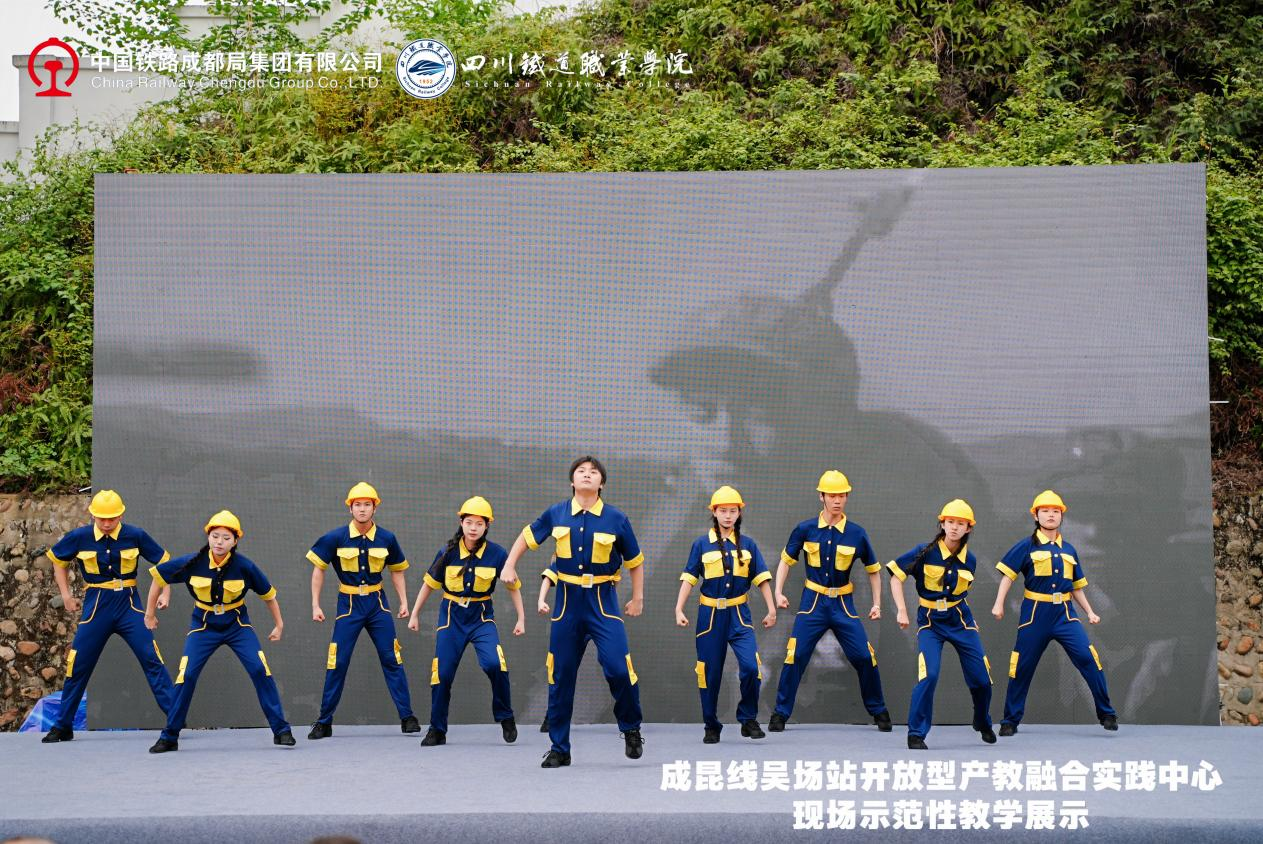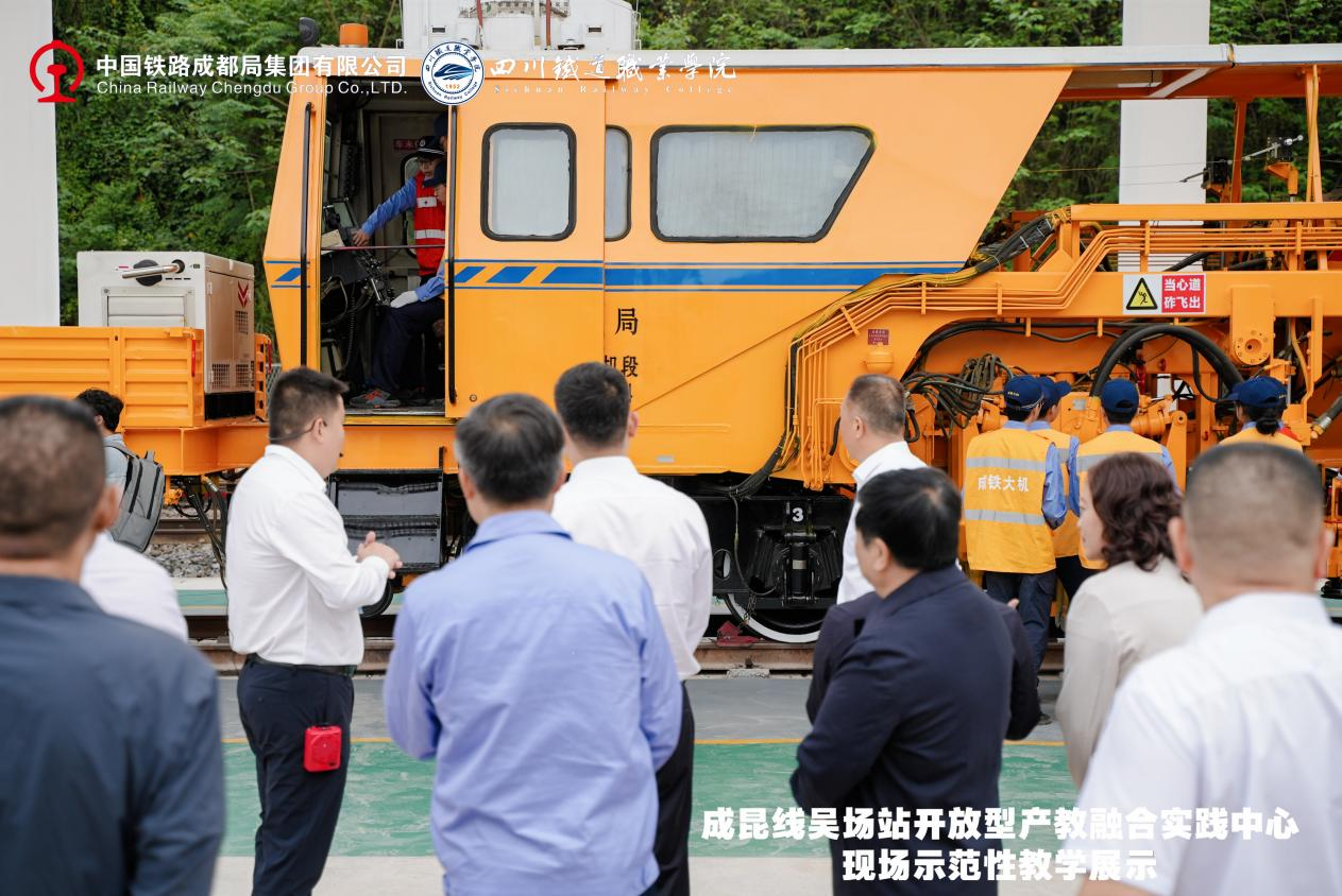 2025年4月22日,在成昆线吴场站开放型产教融合实践中心,举行了一场情景沉浸式现场示范性教学活动。活动以成昆铁路红色基因为精神坐标,共同探讨校企协同育人创新路径、产教融合赋能发展。 现场教学围绕技能实践与传承成昆精神进行了实践课、思政课、文化课“三个课堂”的教学示范。实践课以技能为中心,企业学员和学校学生在现场师傅和学校教师的共同指导下,展示铁路无人机巡检、铁路大型养路机械综合实训、钢轨探伤技能实训、铁路线路检修实训四个课程的实践教学过程,创新构建了“车间即课堂、项目即工作、师傅即导师”的立体化育人体系;思政课以“成昆精神铸时代丰碑,铁路强国载复兴伟业”为主题,以成昆精神为核心,通过历史回溯、人物故事和时代感悟,生动诠释了“战山斗水、坚守奉献、创新争先”的精神内涵;文化课《情满成昆》改编自以成都局集团有限公司为2017年春晚打造的文化传承作品,学校师生将作品转化为美育课程创新作业,以成昆铁路建设、运营与发展为主线,生动回忆铁路人扎根一线、服务社会的使命担当。文化课《大道回响》以原创诗词形式,聚焦成昆铁路修建背景与艰辛历程,生动还原铁路建设者攻坚克难的奋斗史诗。
