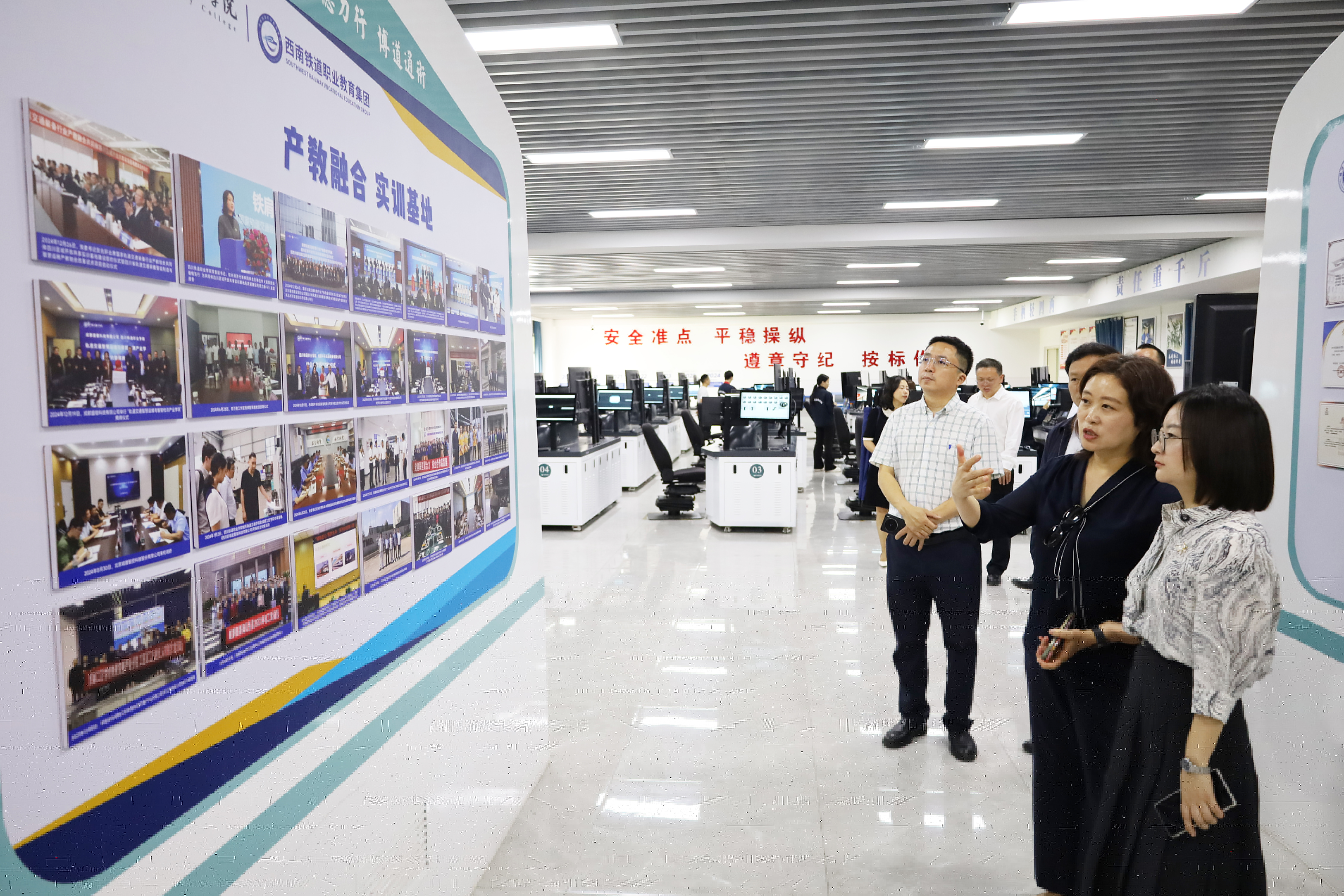 杨丹一行实地考察了pp电子特色教学实训场所,在铁道精神博物馆暨校史馆,杨丹通过珍贵的历史资料和实物展品,深入了解了学校发展历程和铁路文化传承;在“四电集成”实训基地,她仔细观摩了铁道工程技术、铁道供电技术等专业实训教学;在动车组模拟驾驶考培基地,杨丹亲自体验了模拟驾驶系统。