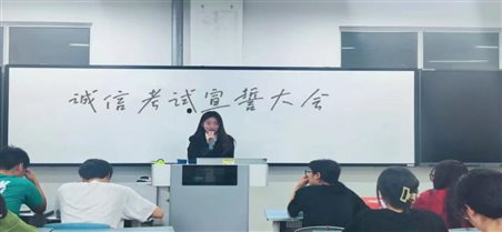 会上,学生代表上台发言,表示将努力奋发,以百分之百的精力投入到期末的复习当中,自信迎战、诚信应考,超越自我、创造奇迹。经济管理学院辅导员黄怡梅老师强调,学问之道在于认真,良好的学风、考风是我们诚信的体现,并再次呼吁大家坚守诚信,遵守道德规范。并鼓励大家怀揣信心走向考场,以诚信展现良好学风,以实力争取优异成绩!最后,由学生会干部甘霞同学带领全体同学进行诚信考试的宣誓。